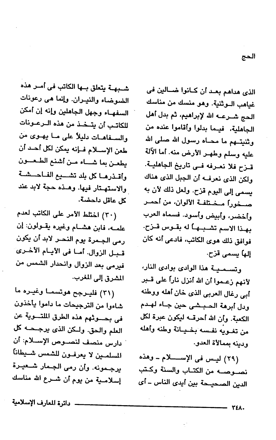 (31) فليرجح هوتسما وغيره ما شاءوا من الترجيحات ما داموا يأخذون في بحوثهم هذه الطرق الملتوية عن العلم والحق. ولكن الذي يرجحه كل دارس منصف لنصوص الإِسلام: أن المسلمين لا يعرفون للشمس شيطانًا يرجمونه. وأن رمى الجمار شعيرة إسلامية من يوم أن شرع الله مناسك