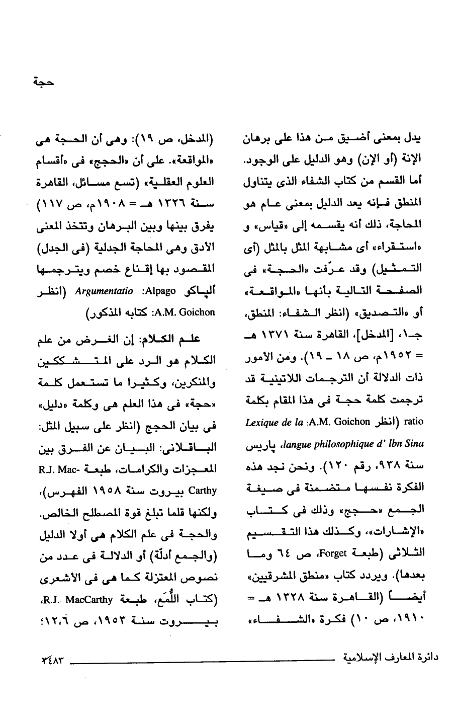 يدل بمعنى أضيق من هذا على برهان الإنة (أو الإن) وهو الدليل على الوجود. أما القسم من كتاب الشفاء الذي يتناول المنطق فإنَّه يعد الدليل بمعنى عام هو المحاجة، ذلك أنَّه يقسمه إلى "قياس" و "استقراء" أي مشابهة المثل بالمثل (أى التمثيل) وقد عرّفت "الحجة" في الصفحة التالية بأنها "المواقعة" أو "التصديق" (انظر الشفاء: المنطق، جـ 1، [المدخل]، القاهرة سنة 1371 هـ = 1952 م، ص 18 - 19). ومن الأمور ذات الدلالة أن الترجمات اللاتينية قد ترجمت كلمة حجة في هذا المقام بكلمة ratio (انظر Lexique de la: A.M. Goichon langue philosophique d' lbn Sina، باريس سنة 938، رقم 120). ونحن نجد هذه الفكرة نفسها متضمنة في صيغة الجمع "حجج" وذلك في كتاب "الإشارات"، وكذلك هذا التقسيم الثلاثى (طبعة Forget، ص 64 وما بعدها). ويردد كتاب "منطق المشرقيين" أيضًا (القاهرة سنة 1328 هـ = 1910، ص 10) فكرة "الشفاء" (المدخل، ص 19): وهي أن الحجة هى "المواقعة". على أن "الحجج" في "أقسام العلوم العقلية" (تسع مسائل، القاهرة سنة 1326 هـ = 1908 م، ص 117) يفرق بينها وبين البرهان وتتخذ المعنى الأدق وهي المحاجة الجدلية (في الجدل) المقصود بها إقناع خصم ويترجمها ألباكو Argumentatio: Alpago (انظر A.M. Goichon: كتابه المذكور)