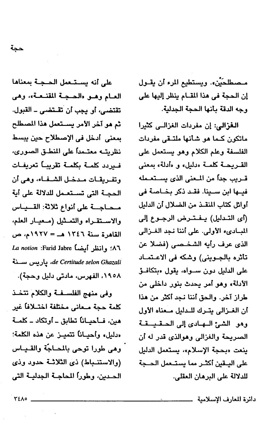 على أنَّه يستعمل الحجة بمعناها العام وهو "الحجة المقنعة"، وهي تقتضى، أو يجب أن تقتضى - القبول. ثمَّ هو آخر الأمر يستعمل هذا المصطلح بمعنى أدخل في الإصطلاح حين يبسط نظريته معتمدًا على المنطق الصوري، فيردد كلمة بكلمة تقريبًا تعريفات وتفريقات مدخل الشفاء، وهي أن الحجة التي تستعمل للدلالة على أية محاجة على أنواع ثلاثة: القياس والاستقراء والتمثيل (معيار العلم، القاهرة سنة 1346 هـ = 1927 م، ص 86؛ وانظر أيضًا La notion: Farid Jabre de Certitude selon Ghazali، باريس سنة 1958، الفهرس، مادتى دليل وحجة).