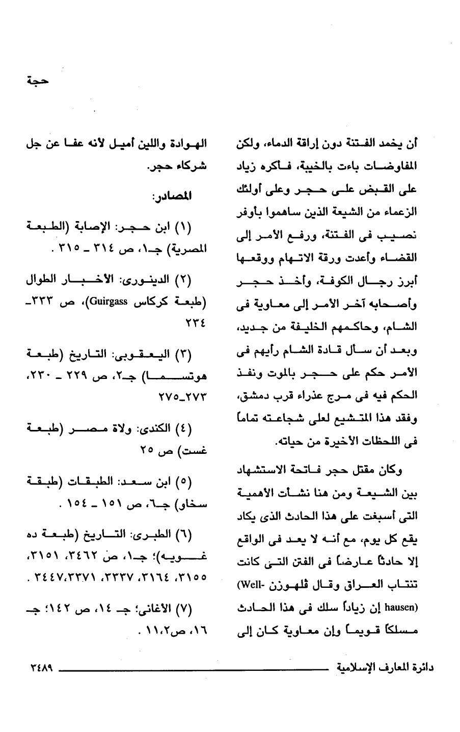 أن يخمد الفتنة دون إراقة الدماء، ولكن المفاوضات باءت بالخيبة، فأكره زياد على القبض على حجر وعلى أولئك الزعماء من الشيعة الذين ساهموا بأوفر نصيب فى الفتنة، ورفع الأمر إلى القضاء وأعدت ورقة الاتهام ووقعها أبرز رجال الكوفة، وأخذ حجر واصحابه آخر الأمر إلى معاوية فى الشام، وحاكمهم الخليفة من جديد، وبعد أن سأل قادة الشام رأيهم فى الأمر حكم على حجر بالموت ونفذ الحكم فيه فى مرج عذراء قرب دمشق، وفقد هذا المتشيع لعلى شجاعته تمامًا فى اللحظات الأخيرة من حياته.