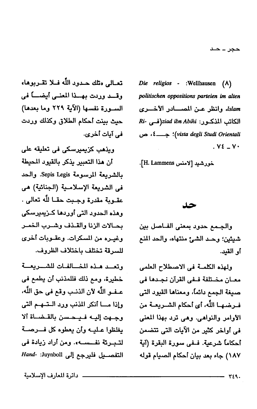 ويذهب كزيميرسكى فى تعليقه على أن هذا التعبير يذكر بالقيود المحيطة بالشريعة المرسومة Sepis Legis. والحد فى الشريعة الإسلامية (الجنائية) هى عقوبة مقدرة وجبت حقا لله تعالى. وهذه الحدود التى أوردها كزيميرسكى بحالات الزنا والقذف وشرب الخمر وغيره من المسكرات. وعقوبات أخرى للسرقة تختلف باختلاف الظروف.
