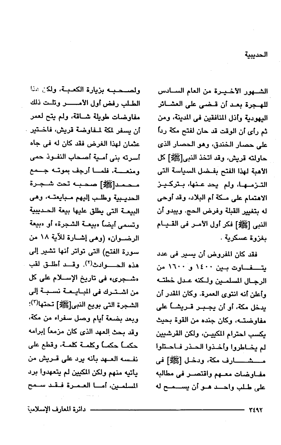 فقد كان المفروض أن يسير فى عدد يتفاوت بين 1400 و 1600 من الرجال المسلمين ولكنه عدل خطته وأعلن أنه انتوى العمرة. وكان المقدر أن يدخل مكة، أو أن يجبر قريشًا على مفاوضته، وكان جنده من القوة بحيث يكسب احترام المكيين، ولكن القرشيين لم يخاطروا وأخذوا الحذر فاحتلوا مشارف مكة، ودخل [- صلى الله عليه وسلم -] فى مفاوضات معهم واقتصر فى مطالبه على طلب واحد هو أن يسمح له ولصحبه بزيارة الكعبة، ولكن هذا الطلب رفض اول الأمر وتلت ذلك مفاوضات طويلة شاقة، ولم يتح لعمر أن يسفر لمكة لمفاوضة قريش، فاختير. عثمان لهذا الغرض فقد كان له فى جاه أسرته بنى أمية أصحاب النفوذ حمى ومنعة، فلما أرجف بموته جمع محمد [- صلى الله عليه وسلم -] صحبه تحت شجرة الحديبية وطلب إليهم مبايعته، وهى البيعة التى يطلق عليها بيعة الحديبية وتسمى أيضًا "بيعة الشجرة" أو "بيعة الرضوان" (وهى إشارة للآية 18 من سورة الفتح) التى تواتر انها تشير إلى هذه الحوادث (2). وقد أطلق لقب "شجرى" فى تاريخ الإسلام على كل من اشترك فى المبايعة نسبة إلى الشجرة التى بويع النبى [- صلى الله عليه وسلم -] تحتها (3)؛ وبعد بضعة أيام وصل سفراء من مكة، وقد بحث العهد الذى كان مزمعًا إبرامه حكمًا حكمًا وكلمة كلمة، وقطع على نفسه العهد بأنه يرد على قريش من يأتيه منهم ولكن المكيين لم يتعهدوا برد المسلمين، أما العمرة فقد سمح