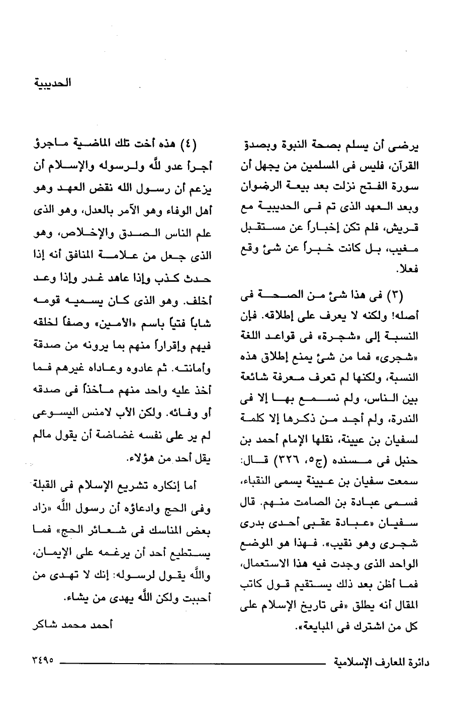 (3) فى هذا شئ من الصحة فى أصله! ولكن لا يعرف على إطلاقه. فإن النسبة إلى "شجرة" فى قواعد اللغة "شجرى" فما من شئ يمنع إطلاق هذه النسبة، ولكنها لم تعرف معرفة شائعة بين الناس، ولم نسمع بها إلا فى الندرة، ولم أجد من ذكره إلا كلمة لسفيان بن عيينة، نقلها الإمام أحمد بن حنبل فى مسنده (ج 5، 326) قال: سمعت سفيان بن عيينة يسمى النقباء، فسمى عبادة بن الصامت منهم. قال سفيان "عبادة عقبى أحدى بدرى شجرى وهو نقيب". فهذا هو الموضع الواحد الذى وجدت فيه هذا الاستعمال، فما أظن بعد ذلك يستقيم قول كاتب المقال أنه يطلق "فى تاريخ الإسلام على كل من اشترك فى المبايعة".