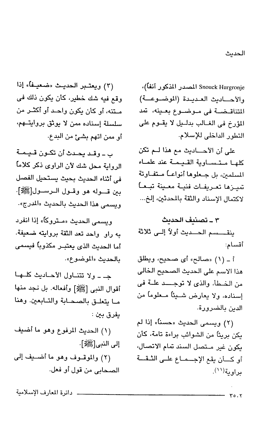 Snouck Hurgronje المصدر المذكور آنفًا)، والأحاديث العديدة (الموضوعة) المتناقضة فى موضوع بعينه، تمد المؤرخ فى الغالب بدليل لا يقوم على التطور الداخلى للإسلام.