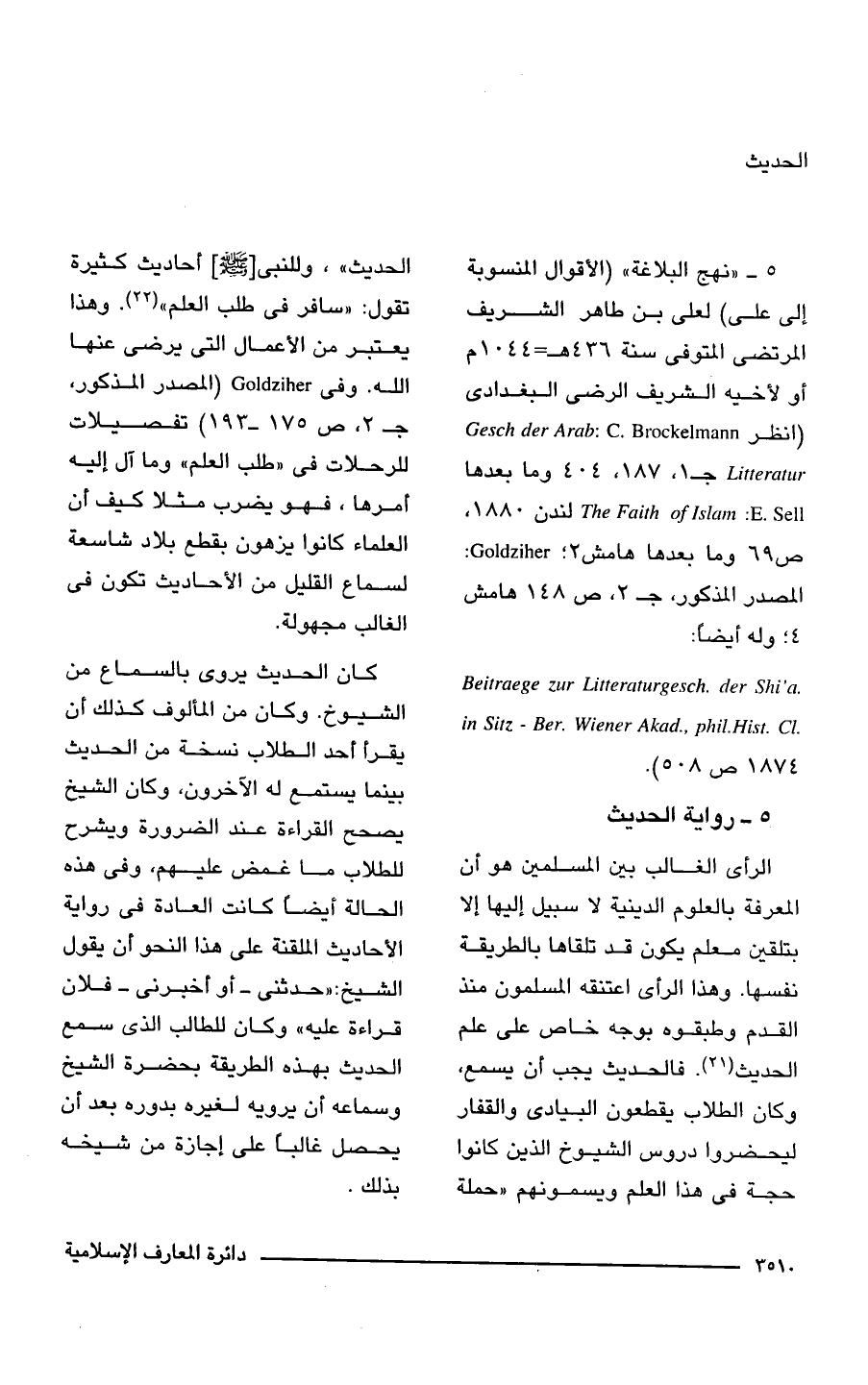 الرأى الغالب بين المسلمين هو أن المعرفة بالعلوم الدينية لا سبيل إليها إلا بتلقين معلم يكون قد تلقاها بالطريقة نفسها. وهذا الرأى اعتنقه المسلمون منذ القدم وطبقوه بوجه خاص على علم الحديث (21). فالحديث يجب أن يسمع، وكان الطلاب يقطعون البيادى والقفار ليحضروا دروس الشيوخ الذين كانوا حجة فى هذا العلم ويسمونهم "حملة الحديث"، وللنبى [- صلى الله عليه وسلم -] أحاديث كثيرة تقول: "سافر فى طلب العلم" (22). وهذا يعتبر من الأعمال التى يرضى عنها الله. وفى Goldziher (المصدر المذكور، جـ 2، ص 175 - 193) تفصيلات للرحلات فى "طلب العلم" وما آل إليه أمرها، فهو يضرب مثلا كيف أن العلماء كانوا يزهون بقطع بلاد شاسعة لسماع القليل من الأحاديث تكون فى الغالب مجهولة.