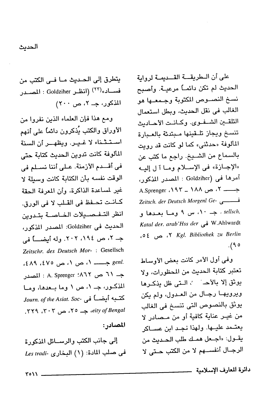 ومع هذا فإن العلماء الذين نفروا من الأوراق والكتب يُذكرون دائمًا على أنهم استثناء لا غير. ويظهر أن السنة المألوفة كانت تدوين الحديث كتابة حتى فى أقدم الأزمنة. على أننا نسلم فى الوقت نفسه بأن الكتابة كانت وسيلة لا غير لمساعدة الذاكرة، وأن المعرفة الحقة كانت تحفظ فى القلب لا فى الورق. انظر التفصيلات الخاصة بتدوين الحديث فى Goldziher: المصدر المذكور، جـ 2, ص 194, 202 وله أيضًا فى Zeitschr. des Deutsch Mor-: Gesellsch genl. جـ 1, ص 1, ص 475, 489, جـ 61 ص 862؛ Sprenger .A: المصدر المذكور، جـ 1، ص 1 وما بعدها، وما كتبه أيضًا فى - Asiat. Soceity of Bengal Journ. of the جـ 25, ص 303, 329.