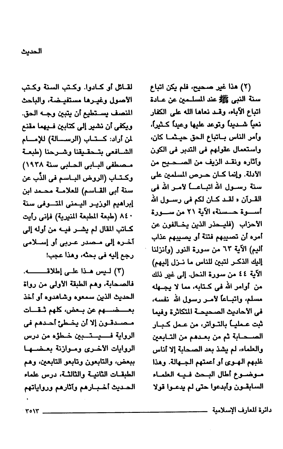 (2) هذا غير صحيح، فلم يكن اتباع سنة النبى - صلى الله عليه وسلم - عند المسلمين عن عادة اتباع الآباء، وقد نعاها الله على الكفار نعيًا شديدًا وتوعد عليها وعيدًا كثيرًا، وأمر الناس باتباع الحق حيثما كان، واستعمال عقولهم فى التدبر فى الكون وآثاره ونقد الزيف من الصحيح من الأدلة. وإنما كان حرص المسلمين على سنة رسول الله اتباعًا لأمر الله فى القرآن "لقد كان لكم فى رسول الله أسوة حسنة" الآية 21 من سورة الأحزاب (فليحذر الذين يخالفون عن أمره أن تصيبهم فتنة أو يصيبهم عذاب أليم) الآية 63 من سورة النور (وأنزلنا اليك الذكر لتبين للناس ما نزل إليهم) الآية 44 من سورة النحل. إلى غير ذلك من أوامر الله فى كتابه، مما لا يجهله مسلم، واتباعًا لأمر رسول الله نفسه، فى الأحاديث الصحيحة المتكاثرة وفيما ثبت عمليًا بالتواتر، من عمل كبار الصحابة ثم من بعدهم من التابعين والعلماء، لم يشذ بعد الصحابة إلا أناس غلبهم الهوى أو أعمتهم الجهالة. وهذا موضوع أطال البحث فيه العلماء السابقون وأبدعوا حتى لم يدعوا قولا لقائل أو كادوا. وكتب السنة وكتب الأصول وغيرها مستفيضة، والباحث المنصف يستطيع أن يتبين وجه الحق. ويكفى أن نشير إلى كتابين فيهما مقنع لمن أراد: كتاب (الرسالة) للإمام الشافعى بتحقيقنا وشرحنا (طبعة مصطفى البابى الحلبى سنة 1938) وكتاب (الروض الباسم فى الذَّب عن سنة أبى القاسم) للعلامة محمد ابن إبراهيم الوزير اليمنى المتوفى سنة 840 (طبعة المطبعة المنيرية) فإنى رأيت كاتب المقال لم يشر فيه من أوله إلى آخره الى مصدر عربى أو إسلامى رجع إليه فى بحثه، وهذا عجب!