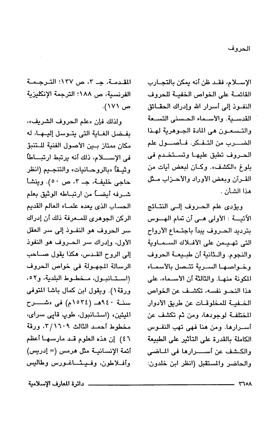 ويؤدى علم الحروف إلى النتائج الآتية: الأولى هى أن تمام الهوس بترديد الحروف يبدأ باجتماع الأرواح التى تهيمن على الأفلاك السماوية والنجوم. والثانية أن طبيعة الحروف وخواصها السرية تتصل بالأسماء المكونة منها. والثالثة أن الأسماء، على هذا النحو نفسه، تكشف عن الخواص الخفية للمخلوقات عن طريق الأدوار المختلفة لوجودها، ومن ثم تكشف عن أسرارها. ومن هنا فهى تهب النفوس الكاملة بالقدرة على التأثير على الطبيعة والكشف عن أسرارها فى الماضى والحاضر والمستقبل (انظر ابن خلدون: المقدمة، جـ 3، ص 137؛ الترجمة الفرنسية، ص 188؛ الترجمة الإنكليزية ص 171).