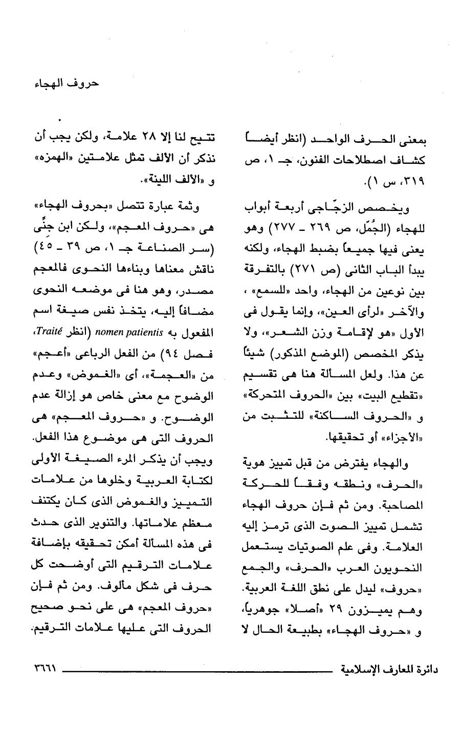 وثمة عبارة تتصل "بحروف الهجاء" هى "حروف المعجم"، ولكن ابن جِنِّى (سر الصناعة جـ 1، ص 39 - 45) ناقش معناها وبناءها النحوى فالمعجم مصدر، وهو هنا فى موضعه النحوى مضافًا إليه، يتخذ نفس صيغة اسم المفعول به nomen patientis (انظر Traite، فصل 94) من الفعل الرباعى "أعجم" من "العجمة"، أى "الغموض" وعدم الوضوح مع معنى خاص هو إزالة عدم الوضوح. و"حروف المعجم" هى الحروف التى هى موضوع هذا الفعل. ويجب أن يذكر المرء الصيغة الأولى لكتابة العربية وخلوها من علامات التمييز والغموض الذى كان يكتنف معظم علاماتها. والتنوير الذى حدث فى هذه المسألة أمكن تحقيقه بإضافة علامات الترقيم التى أوضحت كل حرف فى شكل مألوف. ومن ثم فإن "حروف المعجم" هى على نحو صحيح الحروف التى عليها علامات الترقيم.