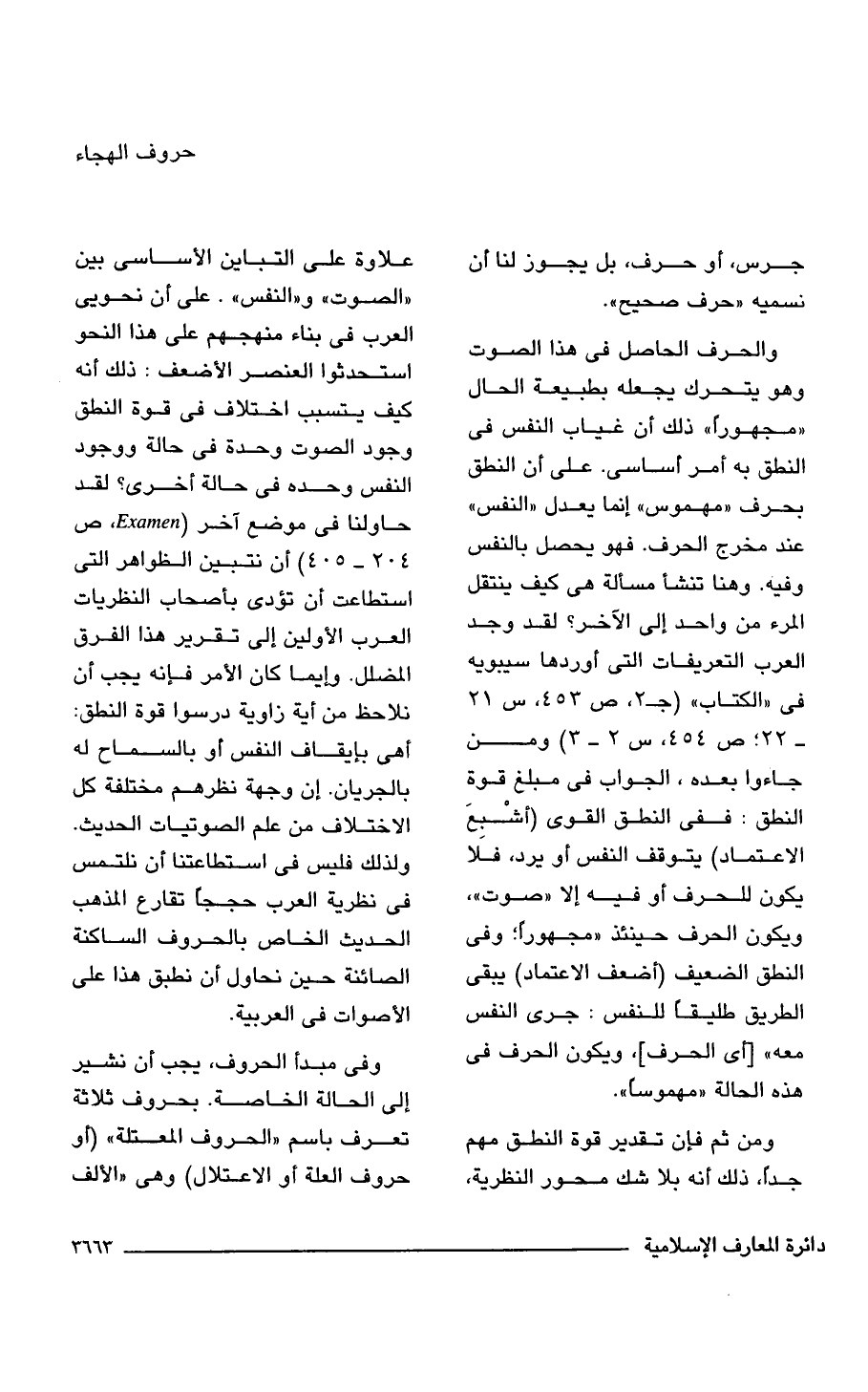 ومن ثم فإن تقدير قوة النطق مهم جدًا، ذلك أنه بلا شك محور النظرية، علاوة على التباين الأساسى بين "الصوت" و"النفس". على أن نحويى العرب فى بناء منهجهم على هذا النحو استحدثوا العنصر الأضعف: ذلك أنه كيف يتسبب اختلاف فى قوة النطق وجود الصوت وحدة فى حالة ووجود النفس وحده فى حالة أخرى؟ لقد حاولنا فى موضع آخر (Examen، ص 204 - 405) أن نتبين الظواهر التى استطاعت أن تؤدى بأصحاب النظريات العرب الأولين إلى تقرير هذا الفرق المضلل. وإيما كان الأمر فإنه يجب أن نلاحظ من أية زاوية درسوا قوة النطق: أهى بإيقاف النفس أو بالسماح له بالجريان. إن وجهة نظرهم مختلفة كل الاختلاف من علم الصوتيات الحديث. ولذلك فليس فى استطاعتنا أن نلتمس فى نظرية العرب حججًا تقارع المذهب الحديث الخاص بالحروف الساكنة الصائنة حين نحاول أن نطبق هذا على الأصوات فى العربية.