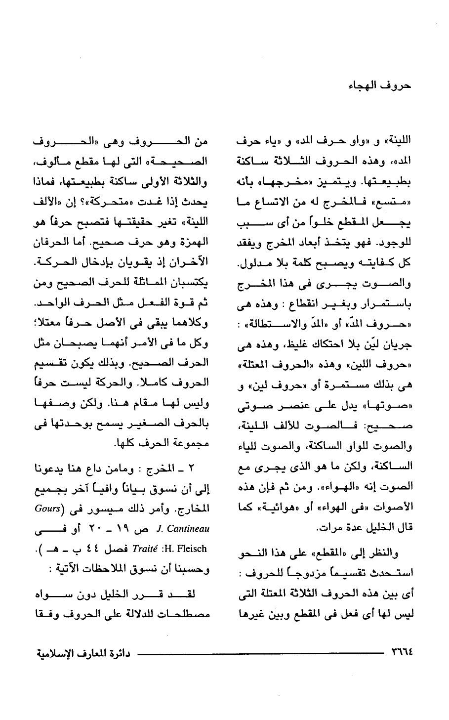 اللينة" و"واو حرف المد" و"ياء حرف المد"، وهذه الحروف الثلاثة ساكنة بطبيعتها. ويتميز "مخرجها" بأنه "متسع" فالمخرج له من الاتساع ما يجعل المقطع خلوًا من أى سبب للوجود. فهو يتخذ أبعاد المخرج ويفقد كل كفايته ويصبح كلمة بلا مدلول. والصوت يجرى فى هذا المخرج باستمرار وبغير انقطاع: وهذه هى "حروف المدّ" أو "المدّ والاستطالة": جريان ليّن بلا احتكاك غليظ، وهذه هى "حروف اللين" وهذه "الحروف المعتلة" هى بذلك مستمرة أو "حروف لين" و "صوتها" يدل على عنصر صوتى صحيح: فالصوت للألف اللينة، والصوت للواو الساكنة، والصوت للياء الساكنة، ولكن ما هو الذى يجرى مع الصوت إنه "الهواء". ومن ثم فإن هذه الأصوات "فى الهواء" أو "هوائية" كما قال الخليل عدة مرات.