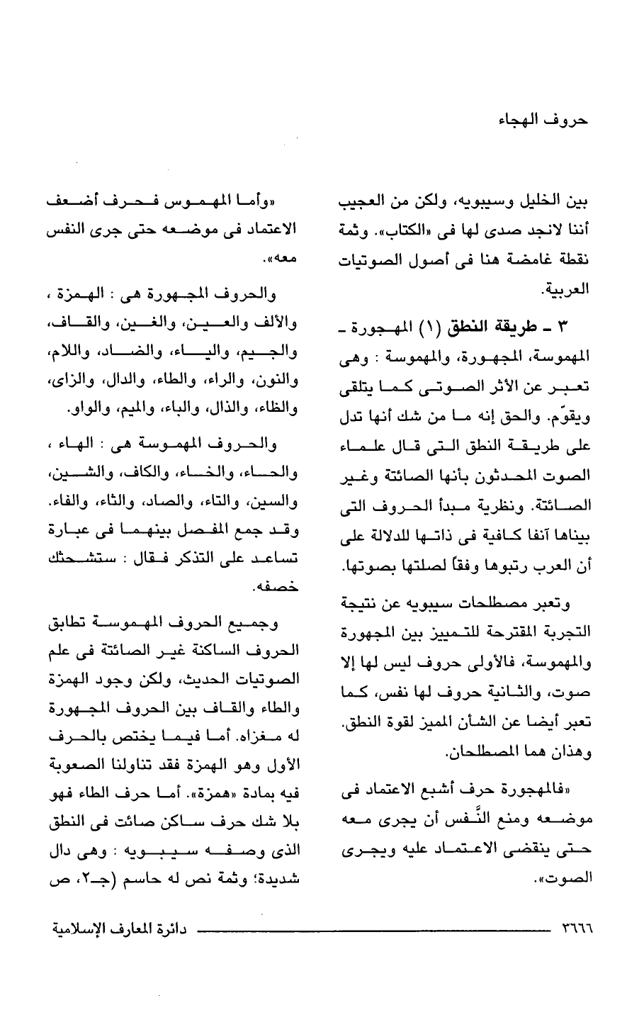3 - طريقة النطق (1) المهجورة - المهموسة، المجهورة، والمهموسة: وهى تعبر عن الأثر الصوتى كما يتلقى ويقوّم. والحق إنه ما من شك أنها تدل على طريقة النطق التى قال علماء الصوت المحدثون بأنها الصائتة وغير الصائتة. ونظرية مبدأ الحروف التى بيناها آنفا كافية فى ذاتها للدلالة على أن العرب رتبوها وفقًا لصلتها بصوتها.