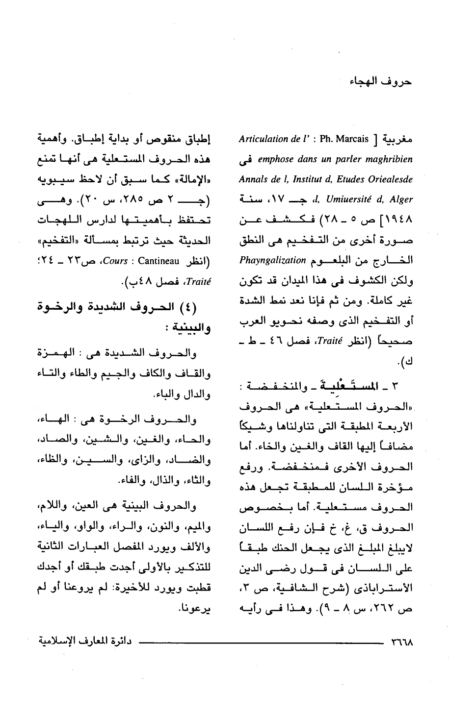 مغربية [Articulation de L': Ph. Marcais emphose dans un parler maghribien فى Annals de l, Institut d, Etudes Oriealesde Umiuersite d, Alger l,, جـ 17، سنة 1948] ص 5 - 28) فكشف عن صورة أخرى من التفخيم هى النطق الخارج من البلعوم Phayngalization ولكن الكشوف فى هذا الميدان قد تكون غير كاملة. ومن ثم فإنا نعد نمط الشدة أو التفخيم الذى وصفه نحويو العرب صحيحًا (انظر Traite, فصل 46 - ط - ك).