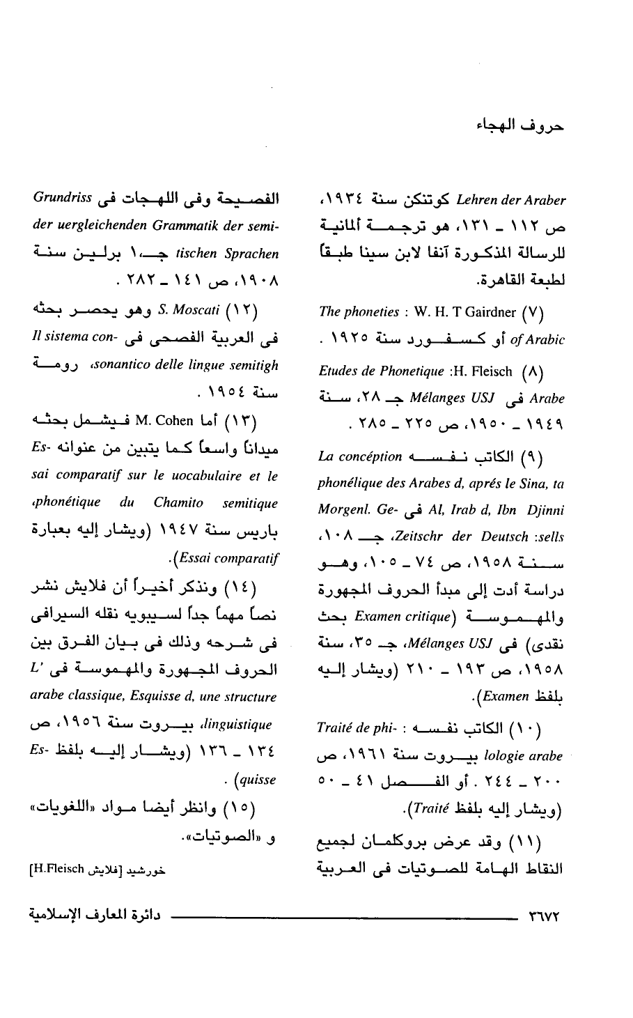 (14) ونذكر أخيرًا أن فلايش نشر نصًا مهمًا جدًا لسيبويه نقله السيرافى فى شرحه وذلك فى بيان الفرق بين الحروف المجهورة والمهموسة فى L' arab classique, Esquisse d, une structure linguistique, بيروت سنة 1956، ص 134 - 136 (ويشار إليه بلفظ Es- quisse).