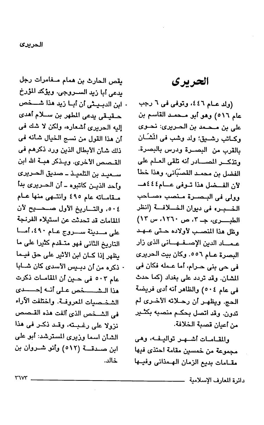 (ولد عام 446، وتوفى فى 6 رجب عام 516) وهو أبو محمد القاسم بن على بن محمد بن الحريرى: نحوى وكاتب رشيق؛ ولد وشب فى المَشَان بالقرب من البصرة ودرس بالبصرة. وتذكر المصادر أنه تلقى العلم على الفضل بن محمد القصَبَانى، وهذا خطأ لأن الفضل هذا توفى عام 444 هـ وولى فى البصرة منصب "صاحب الخبر" فى ديوان الخلافة (انظر الطبرى، جـ 3، ص 1260، س 13) وظل هذا المنصب لأولاده حتى عهد عماد الدين الإصفهانى الذى زار البصرة عام 556. وكان بيت الحريرى فى حى بنى حرام، أما عمله فكان فى المشان. وقد تردد على بغداد (كما حدث فى عام 504) والظاهر أنه أدى فريضة الحج. ويظهر أن رحلاته الأخرى لم تدون. وقد اتصل بحكم منصبه بكثير من أعيان قصبة الخلافة.