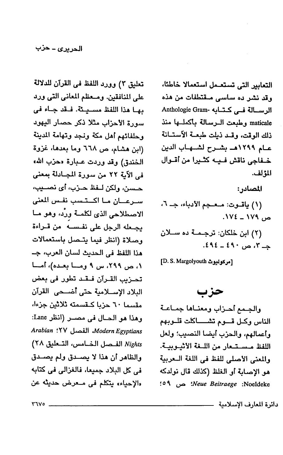 والجمع أحزاب ومعناها جماعة الناس وكل قوم تشاكلت قلوبهم وأعمالهم، والحزب أيضًا النصيب؛ ولعل اللفظ مستعار من اللغة الأثيوبية. والمعنى الأصلى للفظ فى اللغة العربية هو الإصابة أو الغلظ (كذلك قال نولدكه Neue Beitraege: Noeldeke؛ ص 59؛ تعليق 3) وورد اللفظ فى القرآن للدلالة على المنافقين. ومعظم المعانى التى ورد بها هذا اللفظ مسيئة. فقد جاء فى سورة الأحزاب مثلا ذكر حصار اليهود وحلفائهم أهل مكة ونجد وتهامة المدينة (ابن هشام، ص 668 وما بعدها، غزوة الخندق) وقد وردت عبارة "حزب الله" فى الآية 22 من سورة المجادلة بمعنى حسن، ولكن لفظ حزب، أى نصيب، سرعان ما اكتسب نفس المعنى الاصطلاحى الذى لكلمة وِرْد، وهو ما يجعله الرجل على نفسه من قراءة وصلاة (انظر فيما يتصل باستعمالات هذا اللفظ فى الحديث لسان العرب، جـ 1، ص 299، س 9 وما بعده)، أما تحزيب القرآن فقد تطور فى بعض البلاد الإسلامية حتى أضحى القرآن مقسما 60 حزبا كقسمته ثلاثين جزءا، وهذا هو الحال فى مصر (انظر Lane: Modern Egyptians, الفصل 27؛ Arabian Nights الفصل الخامس، التعليق 82) والظاهر أن هذا لا يصدق ولم يصدق فى كل البلاد جميعا، فالغزالى فى كتابه "الإحياء" يتكلم فى معرض حديثه عن