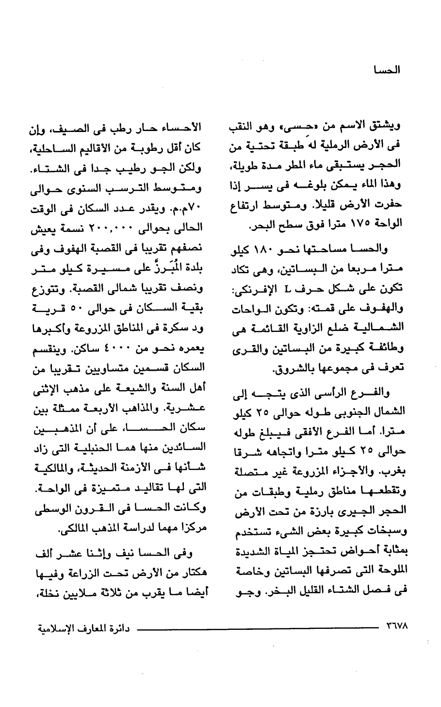 والفرع الرأسى الذى يتجه إلى الشمال الجنوبى طوله حوالى 25 كيلو مترا. أما الفرع الأفقى فيبلغ طوله حوالى 25 كيلو مترا واتجاهه شرقا بغرب. والأجزاء المزروعة غير متصلة وتقطعها مناطق رملية وطبقات من الحجر الجيرى بارزة من تحت الأرض وسبخات كبيرة بعض الشئ تستخدم بمثابة أحواض تحتجز المياة الشديدة الملوحة التى تصرفها البساتين وخاصة فى فصل الشتاء القليل البخر. وجو الأحساء حار رطب فى الصيف، وإن كان أقل رطوبة من الأقاليم الساحلية، ولكن الجو رطيب جدا فى الشتاء. ومتوسط الترسب السنوى حوالى 70 م. م. ويقدر عدد السكان فى الوقت الحالى بحوالى 200,000 نسمة يعيش نصفهم تقريبا فى القصبة الهفوف وفى بلدة المُبَرزَّ على مسيرة كيلو متر ونصف تقريبا شمالى القصبة. وتتوزع بقية السكان فى حوالى 50 قرية ود سكرة فى المناطق المزروعة وأكبرها يعمره نحو من 4000 ساكن. وينقسم السكان قسمين متساويين تقريبا من أهل السنة والشيعة على مذهب الإثنى عشرية. والمذاهب الأربعة ممثلة بين سكان الحسا، على أن المذهبين السائدين منها هما الحنبلية التى زاد شأنها فى الأزمنة الحديثة، والمالكية التى لها تقاليد متميزة فى الواحة. وكانت الحسا فى القرون الوسطى مركزا مهما لدراسة المذهب المالكى.