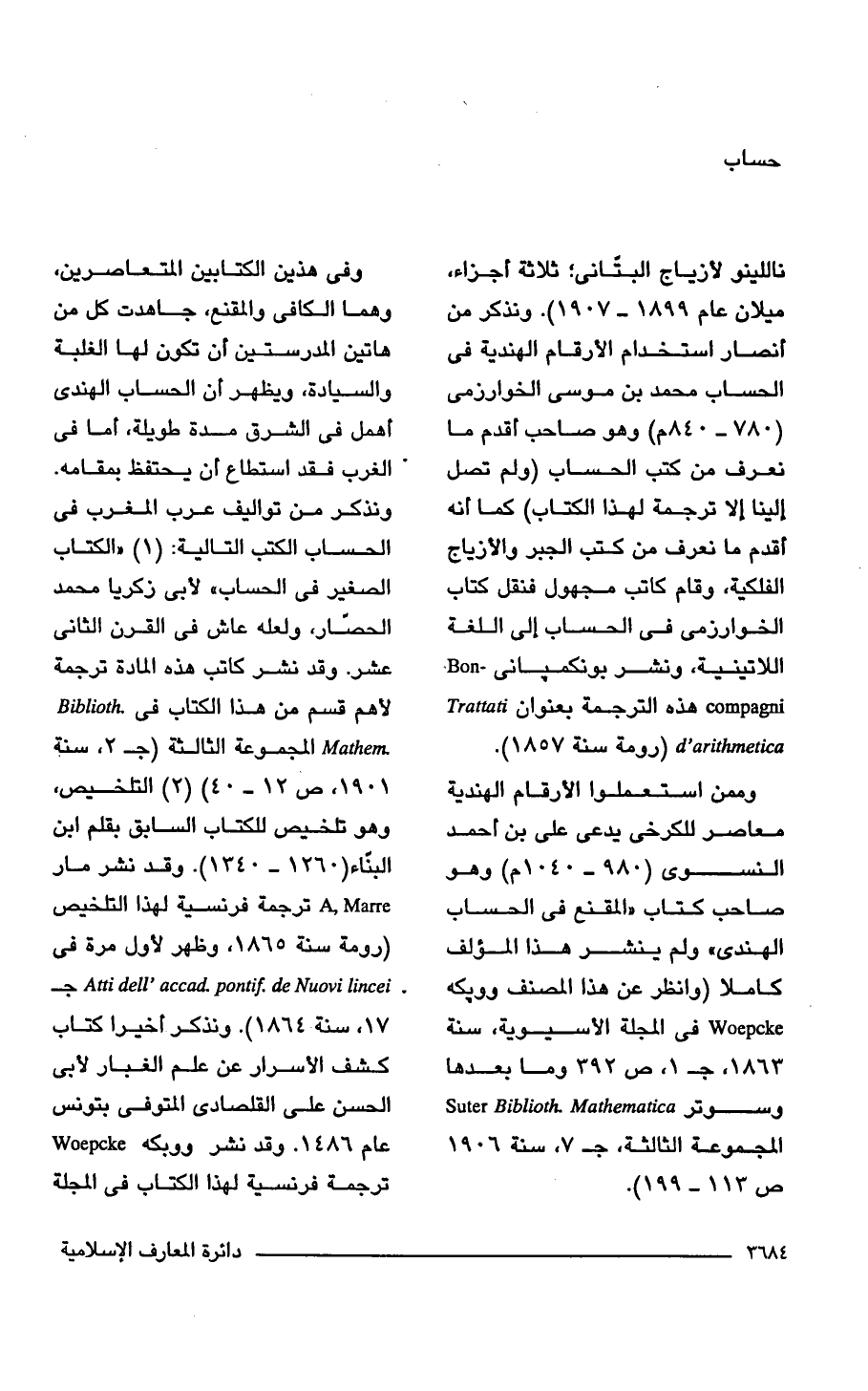 وفى هذين الكتابين المتعاصرين، وهما الكافى والمقنع، جاهدت كل من هاتين المدرستين أن تكون لها الغلبة والسيادة، ويظهر أن الحساب الهندى أهمل فى الشرق مدة طويلة، أما فى الغرب فقد استطاع أن يحتفظ بمقامه. ونذكر من تواليف عرب المغرب فى الحساب الكتب التالية: (1) "الكتاب الصغير فى الحساب" لأبى زكريا محمد الحصّار، ولعله عاش فى القرن الثانى عشر. وقد نشر كاتب هذه المادة ترجمة لأهم قسم من هذا الكتاب فى. Biblioth Mathem المجموعة الثالثة (جـ 2، سنة 1901، ص 12 - 40) (2) التلخيص، وهو تلخيص للكتاب السابق بقلم ابن البنّاء (1260 - 1340). وقد نشر مار A. Marre ترجمة فرنسية لهذا التلخيص (رومة سنة 1865، وظهر لأول مرة فى Atti dell' accad. pontif . de Nuovi lincei جـ 17، سنة 1864). ونذكر أخيرا كتاب كشف الأسرار عن علم الغبار لأبى الحسن على القلصادى المتوفى بتونس عام 1486. وقد نشر ووبكه woepcke ترجمة فرنسية لهذا الكتاب فى المجلة