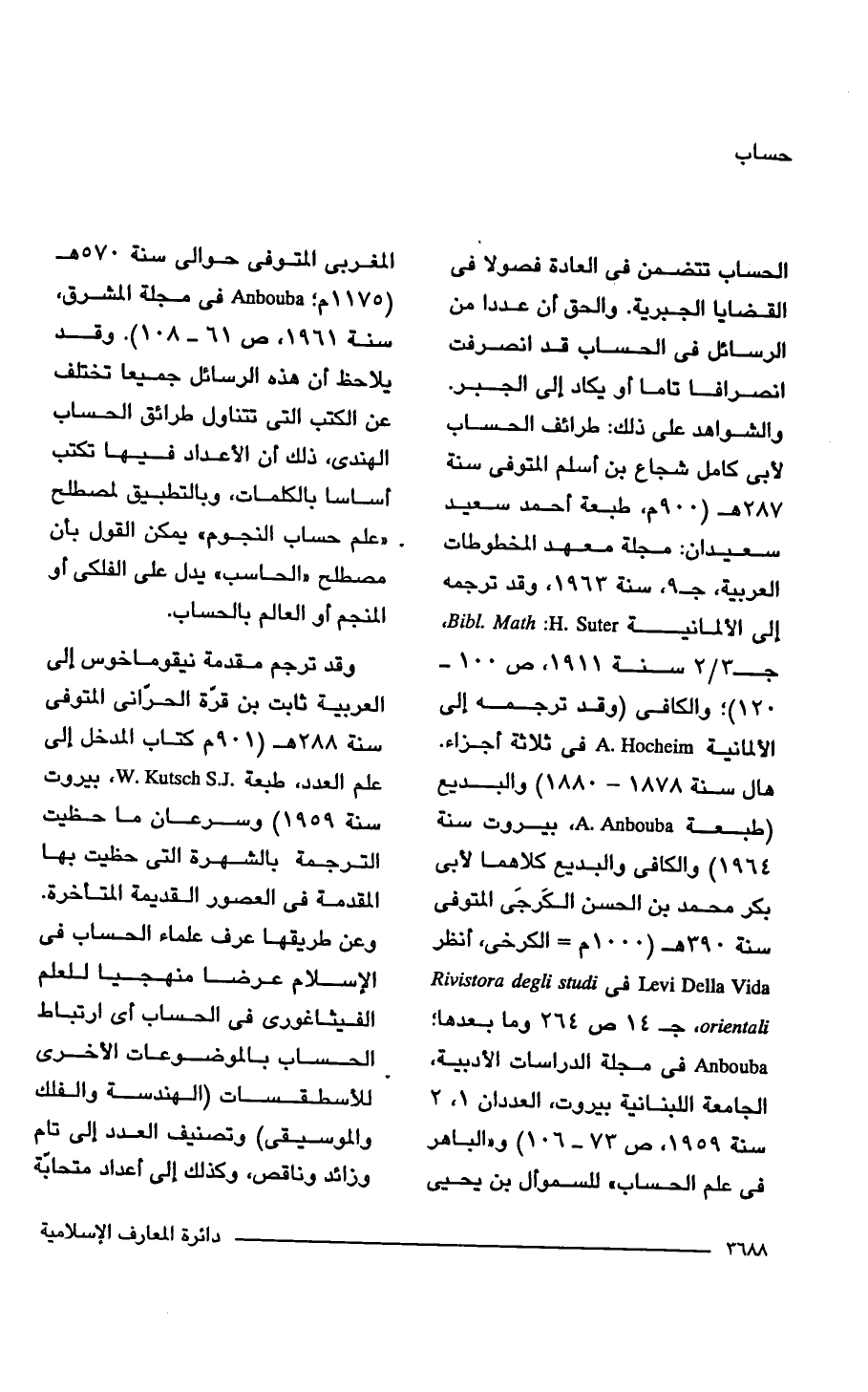 الحساب تتضمن فى العادة فصولا فى القضايا الجبرية. والحق أن عددا من الرسائل فى الحساب قد انصرفت انصرافا تاما أو يكاد إلى الجبر. والشواهد على ذلك: طرائف الحساب لأبى كامل شجاع بن أسلم المتوفى سنة 287 هـ (900 م، طبعة أحمد سعيد سعيدان: مجلة معهد المخطوطات العربية، جـ 9، سنة 1963. وقد ترجمه إلى الألمانية Bibl.Math: H.Suter, جـ 3/ 2 سنة 1911، ص 100 - 120)؛ والكافى (وقد ترجمه إلى الألمانية A. Hocheim فى ثلاثة أجزاء. هال سنة 1878 - 1880) والبديع (طبعة A.Anbouba، بيروت سنة 1964) والكافى والبديع كلاهما لأبى بكر محمد بن الحسن الكَرجَى المتوفى سنة 390 هـ (1000 م = الكرخى، أنظر Levi Della Vida في Rivistora degli studi orientali، جـ 14 ص 264 وما بعدها؛ Anbouba فى مجلة الدراسات الأدبية، الجامعة اللبنانية بيروت، العددان 1، 2 سنة 1959, ص 73 - 106) و"الباهر فى علم الحساب" للسموأل بن يحيى المغربى المتوفى حوالى سنة 570 هـ (1175 م؛ Anbouba فى مجلة المشرق، سنة 1961، ص 61 - 108). وقد يلاحظ أن هذه الرسائل جميعا تختلف عن الكتب التى تتناول طرائق الحساب الهندى، ذلك أن الأعداد فيها تكتب أساسا بالكلمات، وبالتطبيق لمصطلح "علم حساب النجوم" يمكن القول بأن مصطح "الحاسب" يدل على الفلكى أو المنجم أو العالم بالحساب.