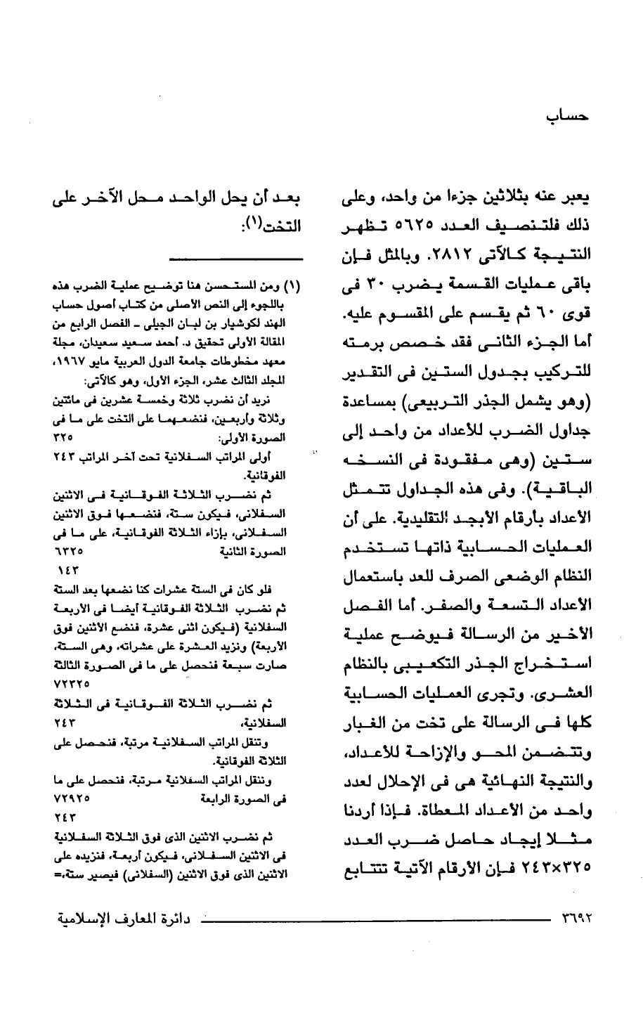 يعبر عنه بثلاثين جزءا من واحد، وعلى ذلك فلتنصيف العدد 5625 تظهر النتيجة كالآتى 2812. وبالمثل فإن باقى عمليات القسمة يضرب 30 فى قوى 60 ثم يقسم على المقسوم عليه. أما الجزء الثانى فقد خصص برمته للتركيب بجدول الستين فى التقدير (وهو يشمل الجذر التربيعى) بمساعدة جداول الضرب للأعداد من واحد الى ستين (وهى مفقودة فى النسخة الباقية). وفى هذه الجداول تتمثل الأعداد بأرقام الأبجد التقليدية. على أن العمليات الحسابية ذاتها تستخدم النظام الوضعى الصرف للعد باستعمال الأعداد التسعة والصفر. أما الفصل الأخير من الرسالة فيوضح عملية استخراج الجذر التكعيبى بالنظام العشرى. وتجرى العمليات الحسابية كلها فى الرسالة على تخت من الغبار وتتضمن المحو والإزاحة للأعداد، والنتيجة النهائية هى فى الإحلال لعدد واحد من الأعداد المعطاة. فإذا أردنا مثلا إيجاد حاصل ضرب العدد 325 × 243 فإن الأرقام الآتية تتتابع بعد أن يحل الواحد محل الآخر على التخت (¬1):