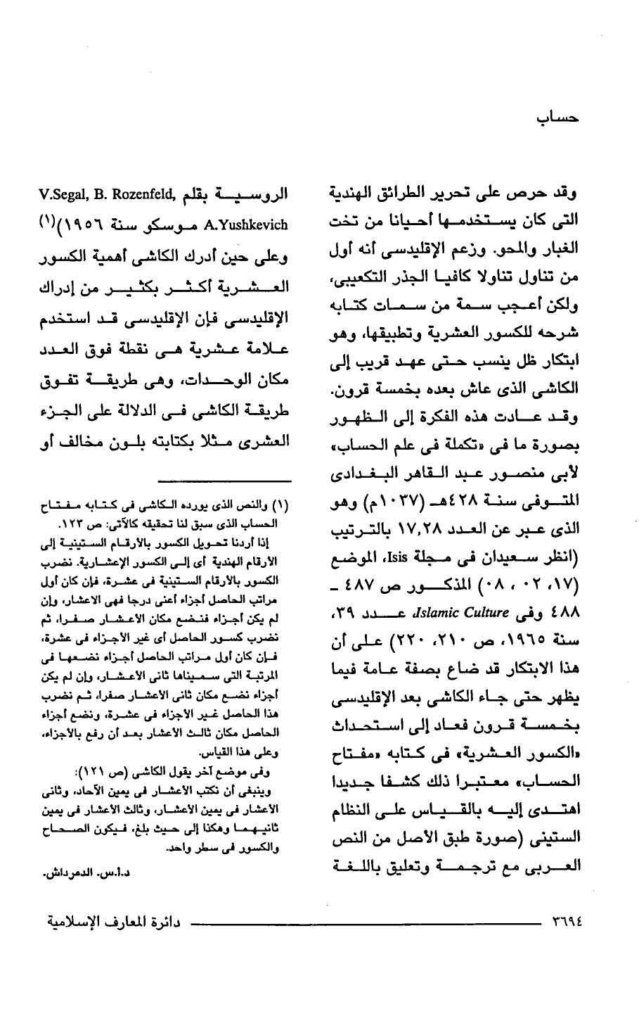 (¬1) والنص الذى يورده الكاشى فى كتابه مفتاح الحساب الذى سبق لنا تحقيقه كالآتى: ص 123.