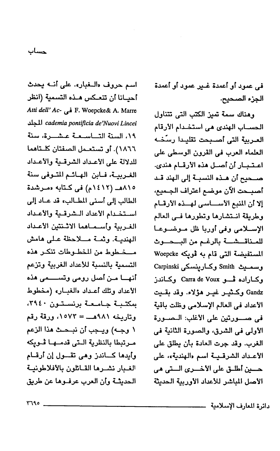 وهناك سمة تميز الكتب التى تتناول الحساب الهندى هى استخدام الأرقام العربية التى أصبحت تقليدا رسّخه العلماء العرب فى القرون الوسطى على اعتبار أن أصل هذه الأرقام هندى. صحيح أن هذه النسبة إلى الهند قد أصبحت الآن موضع اعتراف الجميع، إلا أن المنبع الأساسى لهذه الأرقام وطريقة انتشارها وتطورها فى العالم الإسلامى وفى أوربا ظل موضوعًا للمناقشة بالرغم من البحوث المستفيضة التى قام به فوبكه Woepcke وسميث Smith وكاربنسكى Carpinski وكاراده فو Carra de Voux وكاندز Gandz وكثير غير هؤلاء. وقد بقيت الأعداد فى العالم الإسلامى وظلت باقية فى صورتين على الأغلب: الصورة الأولى فى الشرق، والصورة الثانية فى الغرب. وقد جرت العادة بأن يطلق على الأعداد الشرقية اسم "الهندية"، على حين أطلق على الأخرى التى هى الأصل المباشر للأعداد الأوربية الحديثة اسم حروف "الغبار". على أنه يحدث أحيانا أن تنعكس هذه التسمية (انظر F. Woepcke & A. Marre فى - Atti dell' Ac cademia pontificia de'Nuovi Lincei المجلد 19. السنة التاسعة عشرة، سنة 1866). أو تستعمل الصفتان كلتاهما للدلالة على الأعداد الشرقية والأعداد الغربية، فابن الهائم المتوفى سنة 815 هـ (1412 م) فى كتابه "مرشدة الطالب الى أسنى المطالب" قد عاد إلى استخدام الأعداد الشرقية والأعداد الغربية وأسماهما الاثنتين الأعداد الهندية. وثمة ملاحظة على هامش مخطوط من المخطوطات تنكر هذه التسمية بالنسبة للأعداد الغربية وتزعم أنها من أصل رومى وتسمى هذه الأعداد وتلك أعداد "الغبار" (مخطوط بمكتبة جامعة برنستون 3940، وتاريخه 981 هـ = 1573، ورقة رقم 1 وجه) ويجب أن نبحث هذا الزعم مرتبطا بالنظرية التى قدمها فوبكه وأيدها كاندز وهى تقول إن أرقام الغبار نشرها القائلون بالأفلاطونية الحديثة وأن العرب عرفوها عن طريق