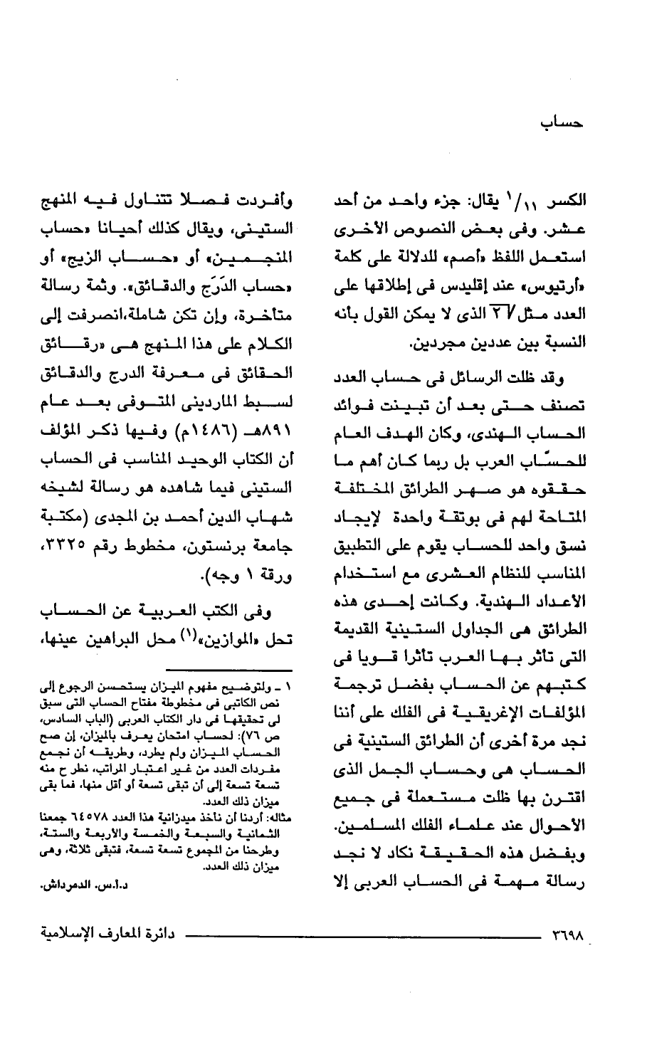 (¬1) ولتوضيح مفهوم الميزان يستحسن الرجوع الى نص الكاتبى فى مخطوطة مفتاح الحساب التى سبق لى تحقيقها فى دار الكتاب العربى (الباب السادس، ص 76): لحساب امتحان يعرف بالميزان، إن صح الحساب الميزان ولم يطرد، وطريقه أن نجمع مفردات العدد من غير اعتبار المراتب، نطرح منه تسعة تسعة الى أن تبقى تسعة أو أقل منها، فما بقى ميزان ذلك العدد.