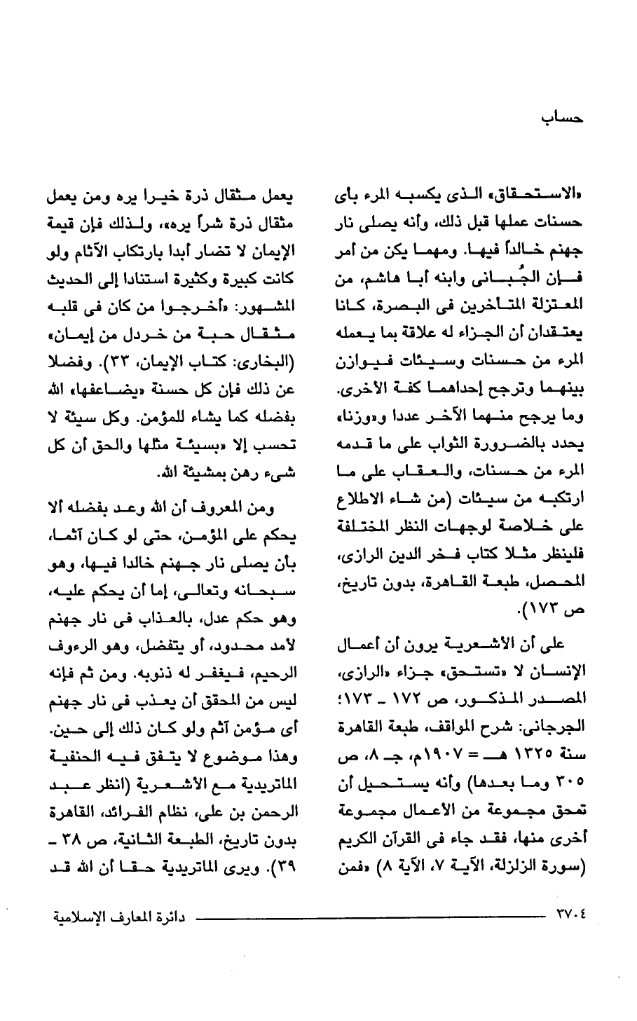 "الاستحقاق" الذى يكسبه المرء بأى حسنات عملها قبل ذلك، وأنه يصلى نار جهنم خالدًا فيها. ومهما يكن من أمر فإن الجُبانى وابنه أبا هاشم، من المعتزلة المتأخرين فى البصرة، كانا يعتقدان أن الجزاء له علاقة بما يعمله المرء من حسنات وسيئات فيوازن بينهما وترجح إحداهما كفة الأخرى. وما يرجح منهما الآخر عددا و"وزنا" يحدد بالضرورة الثواب على ما قدمه المرء من حسنات، والعقاب على ما ارتكبه من سيئات (من شاء الاطلاع على خلاصة لوجهات النظر المختلفة فلينظر مثلا كتاب فخر الدين الرازى، المحصل، طبعة القاهرة، بدون تاريخ، ص 173).