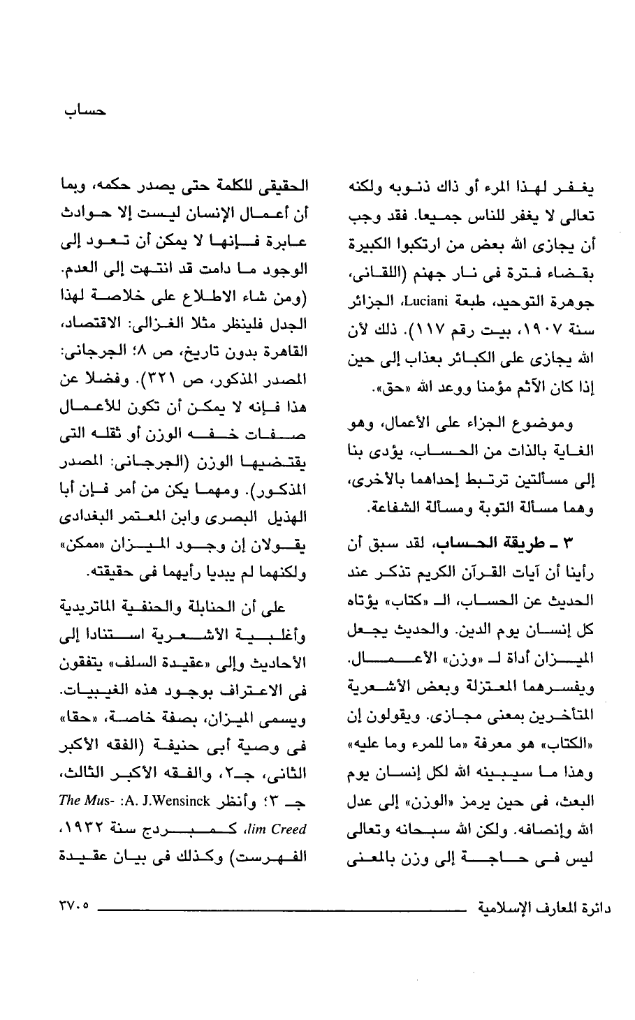 3 - طريقة الحساب، لقد سبق أن رأينا أن آيات القرآن الكريم تذكر عند الحديث عن الحساب، الـ "كتاب" يؤتاه كل إنسان يوم الدين. والحديث يجعل الميزان أداة لـ "وزن" الأعمال. ويفسرهما المعتزلة وبعض الأشعرية المتأخرين بمعنى مجازى. ويقولون إن "الكتاب" هو معرفة "ما للمرء وما عليه" وهذا ما سيبينه الله لكل إنسان يوم البعث، فى حين يرمز "الوزن" إلى عدل الله وإنصافه. ولكن الله سبحانه وتعالى ليس فى حاجة إلى وزن بالمعنى الحقيقى للكلمة حتى يصدر حكمه، وبما أن أعمال الإنسان ليست إلا حوادث عابرة فإنها لا يمكن أن تعود إلى الوجود ما دامت قد انتهت إلى العدم. (ومن شاء الاطلاع على خلاصة لهذا الجدل فلينظر مثلا الغزالى: الاقتصاد، القاهرة بدون تاريخ، ص 8؛ الجرجانى: المصدر المذكور، ص 321). وفضلا عن هذا فإنه لا يمكن أن تكون للأعمال صفات خفه الوزن أو ثقله التى يقتضيها الوزن (الجرجانى: المصدر المذكور). ومهما يكن من أمر فإن أبا الهذيل البصرى وابن المعتمر البغدادى يقولان إن وجود الميزان "ممكن" ولكنهما لم يبديا رأيهما فى حقيقته.