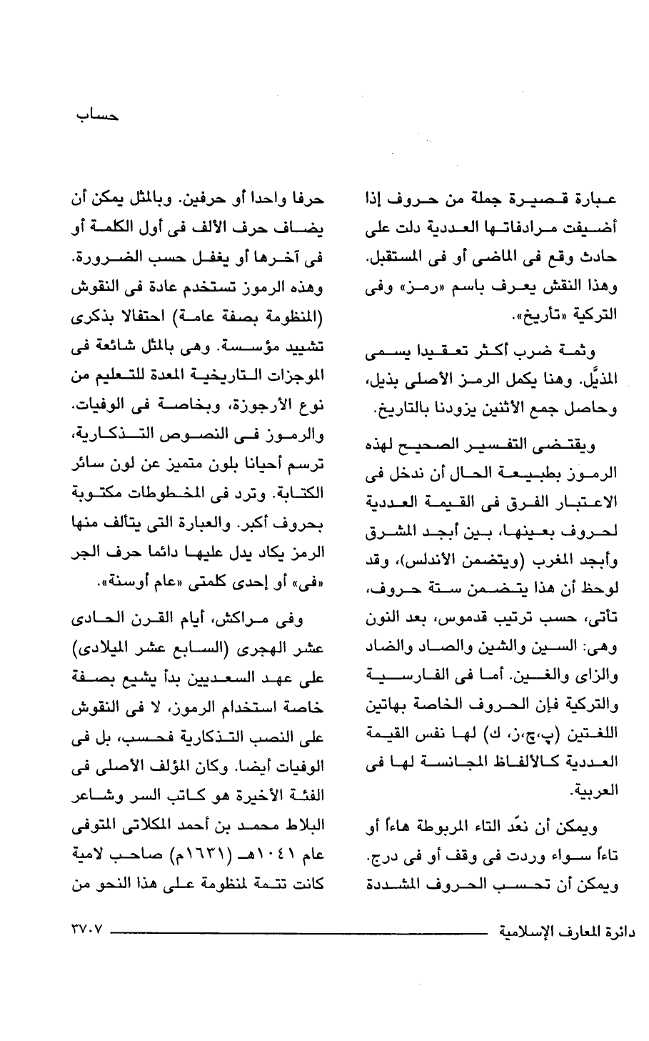 وفى مراكش، أيام القرن الحادى عشر الهجرى (السابع عشر الميلادى) على عهد السعديين بدأ يشيع بصفة خاصة استخدام الرموز، لا فى النقوش على النصب التذكارية فحسب، بل فى الوفيات أيضًا. وكان المؤلف الأصلى فى الفئة الأخيرة هو كاتب السر وشاعر البلاط محمد بن أحمد المكلاتى المتوفى عام 1041 هـ (1631 م) صاحب لامية كانت تتمة لمنظومة على هذا النحو من
