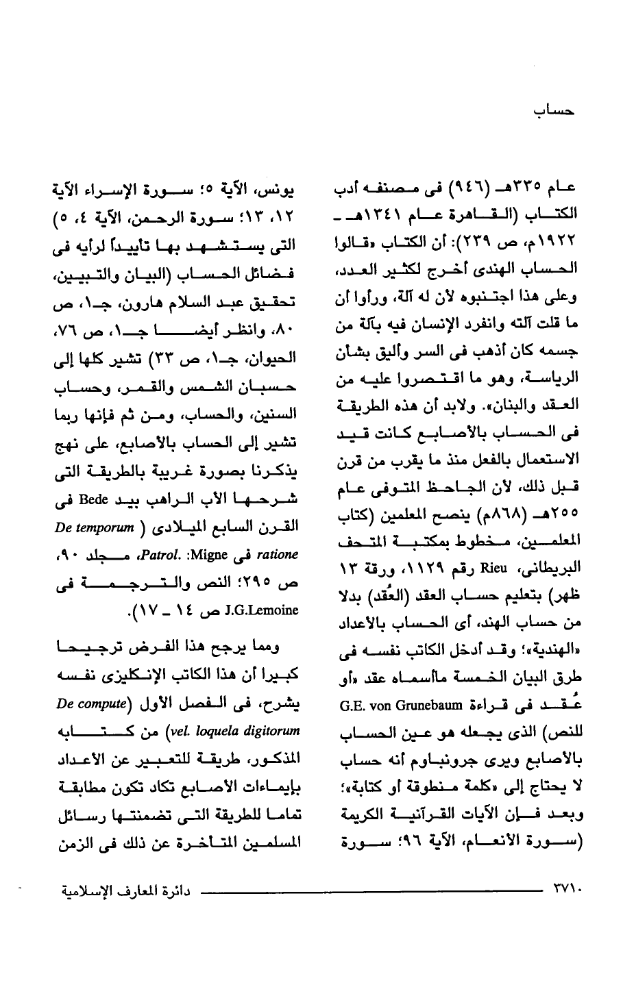 عام 335 هـ (946) فى مصنفه أدب الكتاب (القاهرة عام 1341 هـ - 1922 م، ص 239): أن الكتاب "قالوا الحساب الهندى أخرج لكثير العدد، وعلى هذا اجتنبوه لأن له آلة، ورأوا أن ما قلت آلته وانفرد الإنسان فيه بآلة من جسمه كان أذهب فى السر وأليق بشأن الرياسة، وهو ما اقتصروا عليه من العقد والبنان". ولا بد أن هذه الطريقة فى الحساب بالأصابع كانت قيد الاستعمال بالفعل منذ ما يقرب من قرن قبل ذلك، لأن الجاحظ المتوفى عام 255 هـ (868 م) ينصح المعلمين (كتاب المعلمين، مخطوط بمكتبة المتحف البريطانى، Rieu رقم 1129، ورقة 13 ظهر) بتعليم حساب العقد (العُقد) بدلا من حساب الهند، أى الحساب بالأعداد "الهندية"؛ وقد أدخل الكاتب نفسه فى طرق البيان الخمسة ما أسماه عقد "أو عُقد فى قراءة G.E. von Grunebaum للنص) الذى يجعله هو عين الحساب بالأصابع ويرى جرونباوم أنه حساب لا يحتاج إلى "كلمة منطوقة أو كتابة"؛ وبعد فإن الآيات القرآنية الكريمة (سورة الأنعام، الآية 96؛ سورة يونس، الآية 5؛ سورة الإسراء الآية 12، 13؛ سورة الرحمن، الآية 4، 5) التى يستشهد بها تأييدًا لرأيه فى فضائل الحساب (البيان والتبيين، تحقيق عبد السلام هارون، جـ 1، ص 80، وانظر أيضا جـ 1، ص 76، الحيوان، جـ 1، ص 33) تشير كلها إلى حسبان الشمس والقمر، وحساب السنين، والحساب، ومن ثم فإنها ربما تشير إلى الحساب بالأصابع، على نهج يذكرنا بصورة غريبة بالطريقة التى شرحها الأب الراهب بيد Bede في القرن السابع الميلادى (De temporum ratione فى Patrol.: Migne, مجلد 90، ص 295؛ النص والترجمة فى J.G.Lemoine ص 14 - 17).