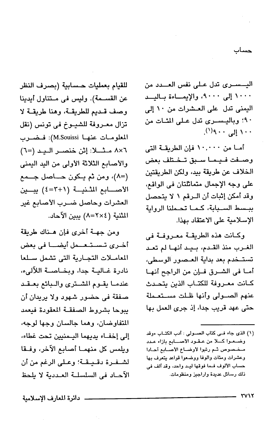 (¬1) الذى جاء فى كتاب الصولى: أدب الكتاب "وقد وضعوا كلا من عقود الأصابع بازاء عدد مخصوص ثم رقبوا لأوضاع الأصابع آحادا وعشرات ومئات والوفا ووضعوا قواعد يتعرف بها حساب الألوف فما فوقها ليد واحد، وقد ألف فى ذلك رسائل عديدة واراجيز ومنظومات.