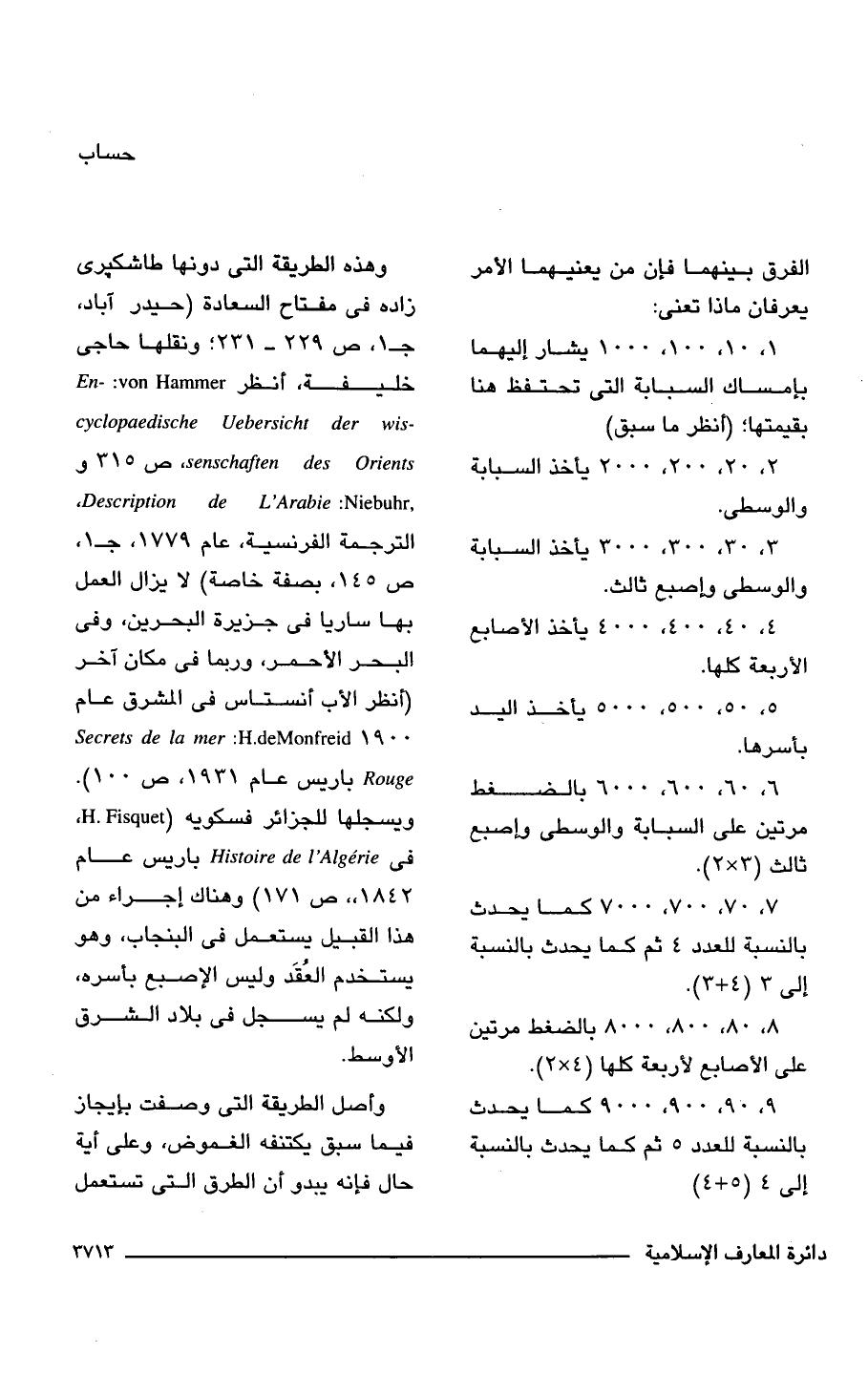 وهذه الطريقة التى دونها طاشكبرى زاده فى مفتاح السعادة (حيدر آباد، جـ 1، ص 229 - 231؛ ونقلها حاجى خليفة، أنظر En-: von Hammer -cyclopaedische Uebersicht der wis senschaften des Orients، ص 315 و Description de L'Arabie: Niebuhr,, الترجمة الفرنسية، عام 1779، جـ 1، ص 145، بصفة خاصة) لا يزال العمل بها ساريا فى جزيرة البحرين، وفى البحر الأحمر، وربما فى مكان آخر (أنظر الأب أنستاس فى المشرق عام 1900 Secrets de la mer: H.deMonfreid Rouge باريس عام 1931، ص 100). ويسجلها للجزائر فسكويه (H. Fisquet، في Histoire de l'Algerie باريس عام 1842، ص 171) وهناك إجراء من هذا القبيل يستعمل فى البنجاب، وهو يستخدم العُقَد وليس الإصبع بأسره، ولكنه لم يسجل فى بلاد الشرق الأوسط.