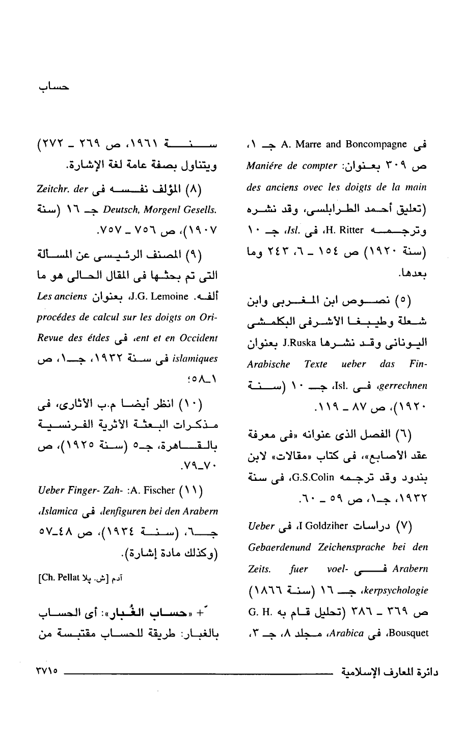 (11) Ueber Finger- Zah-: A. Fischer lenfiguren bei den Arabern فى Islamica, جـ 6، (سنة 1934)، ص 48 - 57 (وكذلك مادة إشارة).