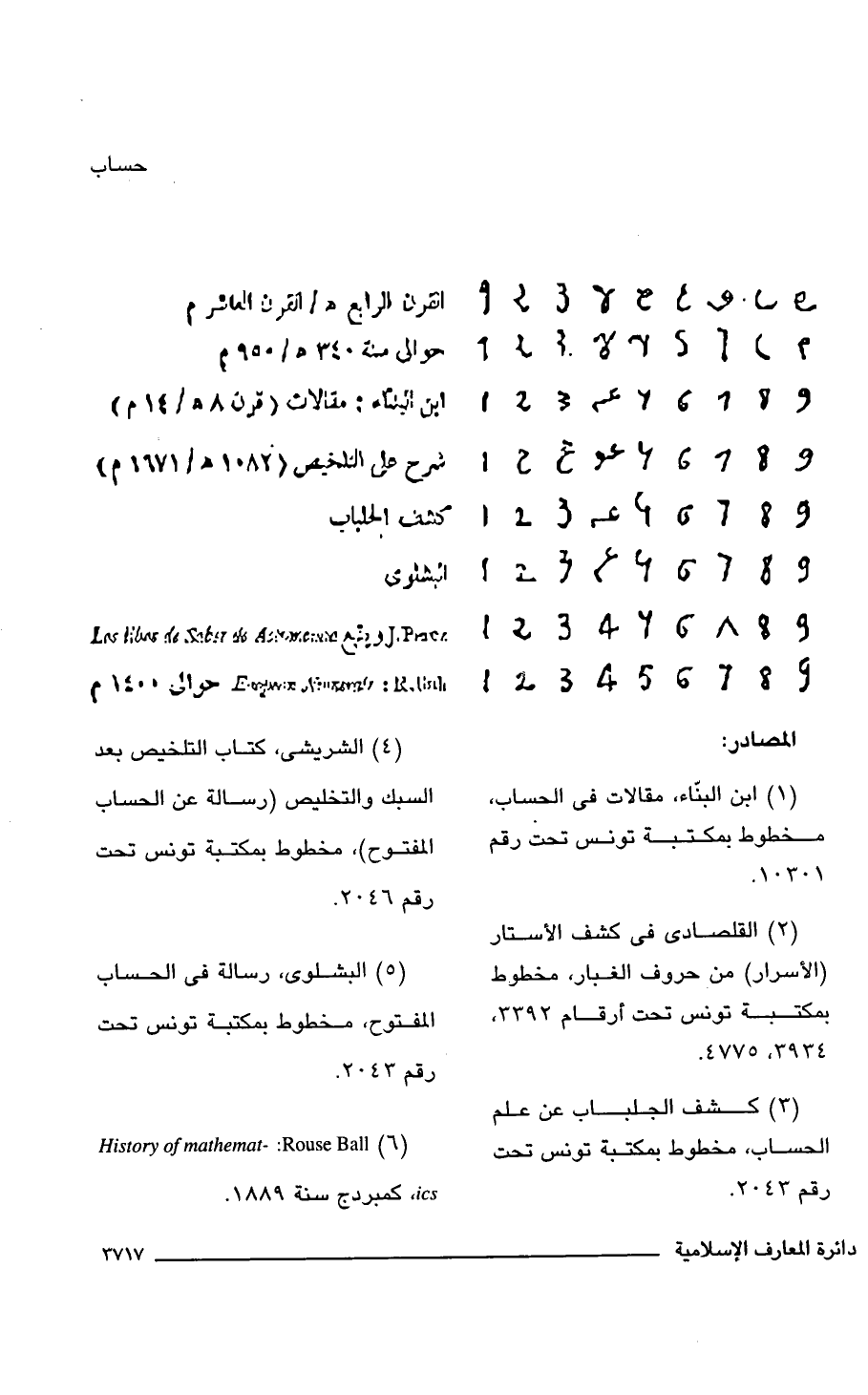 (5) البشلوى، رسالة فى الحساب المفتوح، مخطوط بمكتبة تونس تحت رقم 2043.