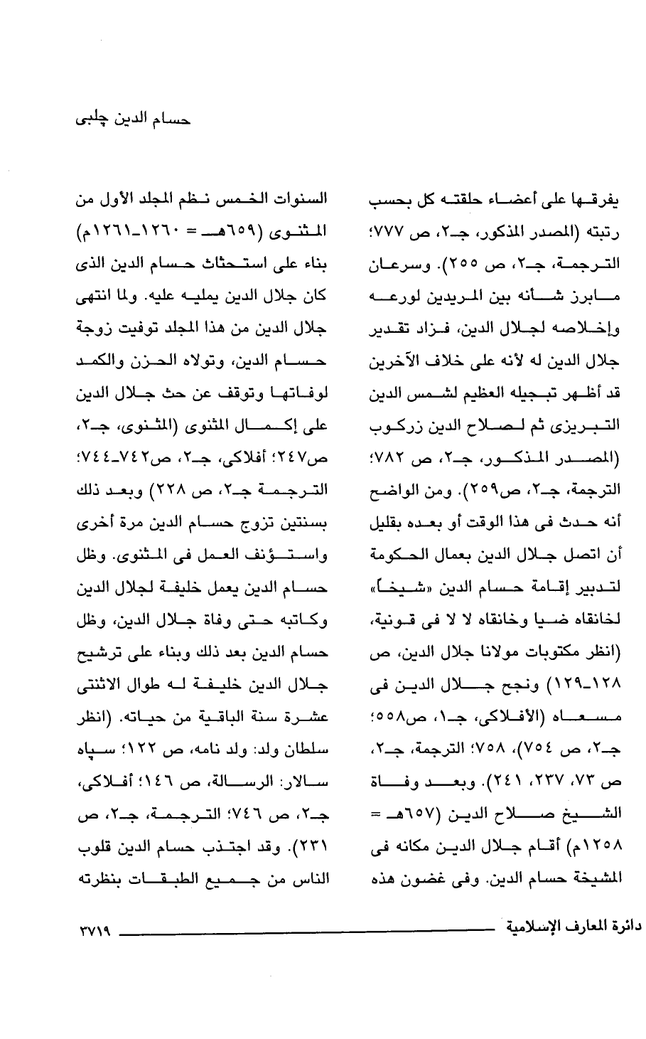 يفرقها على أعضاء حلقته كل بحسب رتبته (المصدر المذكور، جـ 2، ص 777؛ الترجمة، جـ 2، ص 255). وسرعان ما برز شأنه بين المريدين لورعه وإخلاصه لجلال الدين، فزاد تقدير جلال الدين له لأنه على خلاف الآخرين قد أظهر تبجيله العظيم لشمس الدين التبريزى ثم لصلاح الدين زركوب (المصدر المذكور، جـ 2، ص 782؛ الترجمة، جـ 2، ص 259). ومن الواضح أنه حدث فى هذا الوقت أو بعده بقليل أن اتصل جلال الدين بعمال الحكومة لتدبير إقامة حسام الدين "شيخًا"، لخانقاه ضيا وخانقاه لا لا فى قونية، (انظر مكتوبات مولانا جلال الدين، ص 128 - 129) ونجح جلال الدين فى مسعاه (الأفلاكى، جـ 1، ص 558؛ جـ 2، ص 754)، 758؛ الترجمة، جـ 2، ص 73، 237، 241). وبعد وفاة الشيخ صلاح الدين (657 هـ = 1258 م) أقام جلال الدين مكانه فى المشيخة حسام الدين. وفى غضون هذه السنوات الخمس نظم المجلد الأول من المثنوى (659 هـ = 1260 - 1261 م) بناء على استحثاث حسام الدين الذى كان جلال الدين يمليه عليه. ولما انتهى جلال الدين من هذا المجلد توفيت زوجة حسام الدين، وتولاه الحزن والكمد لوفاتها وتوقف عن حث جلال الدين على إكمال المثنوى (المثنوى، جـ 2، ص 247؛ أفلاكى، جـ 2، ص 742 - 744؛ الترجمة جـ 2، ص 228) وبعد ذلك بسنتين تزوج حسام الدين مرة أخرى واستؤنف العمل فى المثنوى. وظل حسام الدين يعمل خليفة لجلال الدين وكاتبه حتى وفاة جلال الدين، وظل حسام الدين بعد ذلك وبناء على ترشيح جلال الدين خليفة له طوال الاثنتى عشرة سنة الباقية من حياته. (انظر سلطان ولد: ولد نامه، ص 122؛ سباه سالار: الرسالة، ص 146؛ أفلاكى، جـ 2، ص 746؛ الترجمة، جـ 2، ص 231). وقد اجتذب حسام الدين قلوب الناس من جميع الطبقات بنظرته