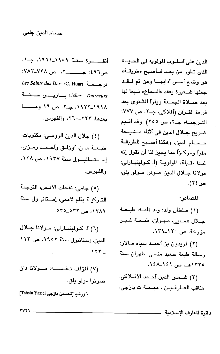 (3) شمس الدين أحمد الأفلاكى: مناقب العارفين، طبعة ت يازجى، أنقرة سنة 1959 - 1961, جـ 1، ص 496؛ جـ 2، ص 738 - 783؛ ترجمة Les Saints des Der-: C. Huart viches Tourneurs باريس سنة 1918 - 1922، جـ 2، ص 19 وما بعدها، 223 - 260، والفهرس.