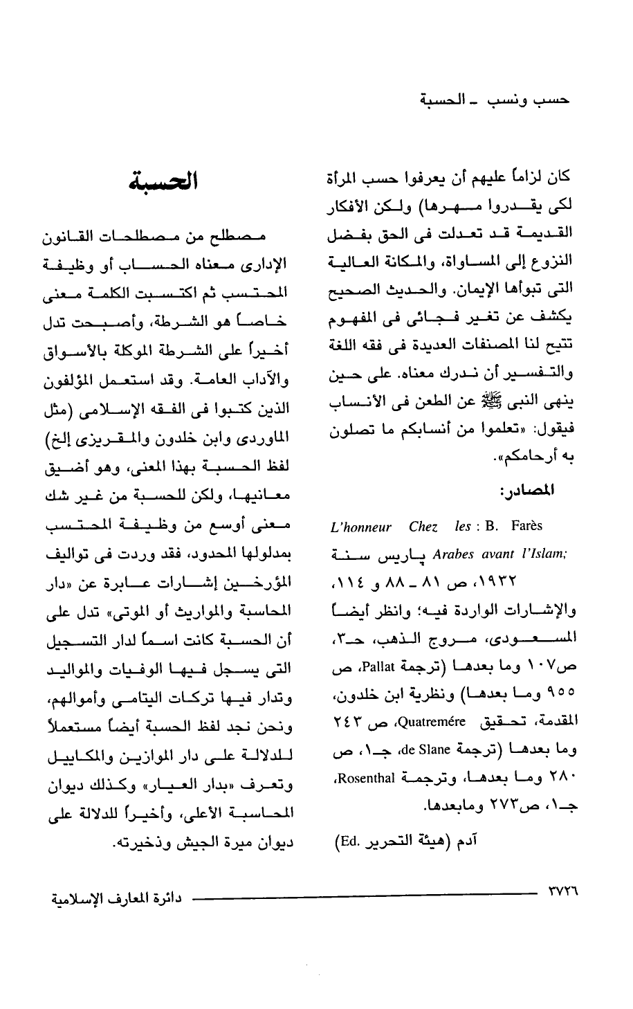 L'honneur Chez les: B. Fares Arabes avant l'Islam; باريس سنة 1932، ص 81 - 88 و 114، والإشارات الواردة فيه؛ وانظر أيضًا المسعودى، مروج الذهب، جـ 3، ص 107 وما بعدها (ترجمة Pallat، ص 955 وما بعدها) ونظرية ابن خلدون، المقدمة، تحقيق Quatremere, ص 243 وما بعدها (ترجمة de Slane, جـ 1، ص 280 وما بعدها، وترجمة Rosenthal، جـ 1، ص 273 وما بعدها.