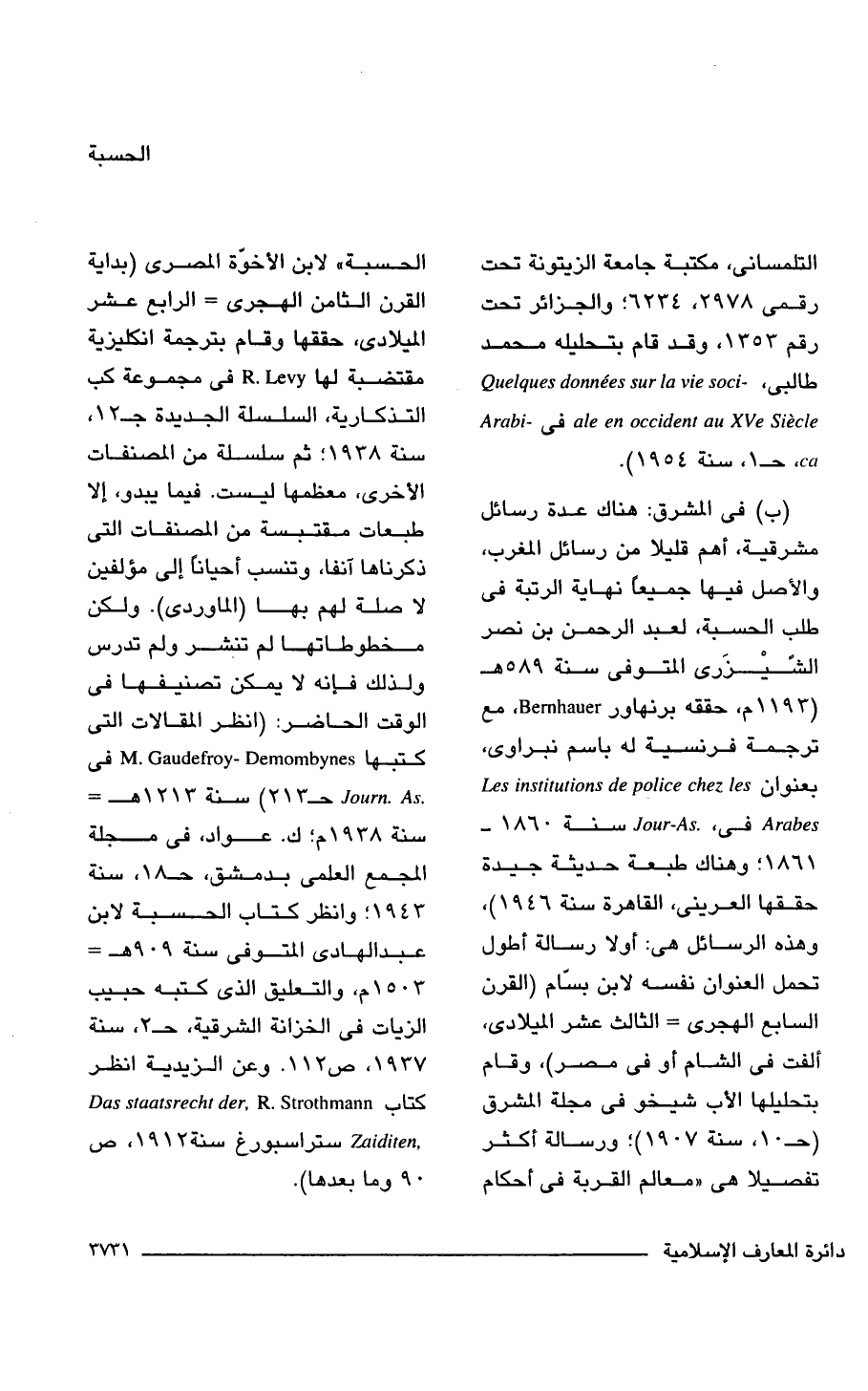 (ب) فى المشرق: هناك عدة رسائل مشرقية، أهم قليلا من رسائل المغرب، والأصل فيها جميعًا نهاية الرتبة فى طلب الحسبة، لعبد الرحمن بن نصر الشّيْزَرى المتوفى سنة 589 هـ (1193 م، حققه برنهاور Bernhauer، مع ترجمة فرنسية له باسم نبراوى، بعنوان Les institutions de police chez les Arabes فى، Jour-As. سنة 1860 - 1861؛ وهناك طبعة حديثة جيدة حققها العرينى، القاهرة سنة 1946) , وهذه الرسائل هى: أولا رسالة أطول تحمل العنوان نفسه لابن بسّام (القرن السابع الهجرى = الثالث عشر الميلادى، ألفت فى الشام أو فى مصر)، وقام بتحليلها الأب شيخو فى مجلة المشرق جـ 10، سنة 1907)؛ ورسالة أكثر تفصيلا هى "معالم القربة فى أحكام الحسبة" لابن الأخوّة المصرى (بداية القرن الثامن الهجرى = الرابع عشر الميلادى، حققها وقام بترجمة انكليزية مقتضبة لها R. Levy فى مجموعة كب التذكارية، السلسلة الجديدة جـ 12، سنة 1938؛ ثم سلسلة من المصنفات الأخرى، معظمها ليست. فيما يبدو، إلا طبعات مقتبسة من المصنفات التى ذكرناها آنفا، وتنسب أحيانًا إلى مؤلفين لا صلة لهم بها (الماوردى). ولكن مخطوطاتها لم تنشر ولم تدرس ولذلك فإنه لا يمكن تصنيفها فى الوقت الحاضر: (انظر المقالات التى كتبها M. Gaudefroy- Demombynes فى Journ. As جـ 213) سنة 1213 هـ = سنة 1938 م؛ ك. عواد، فى مجلة المجمع العلمى بدمشق، جـ 18، سنة 1943؛ وانظر كتاب الحسبة لابن عبد الهادى المتوفى سنة 909 هـ = 1503 م، والتعليق الذى كتبه حبيب الزيات فى الخزانة الشرقية، جـ 2، سنة 1937، ص 112. وعن الزيدية انظر كتاب Das staatsrecht der, R. Strothmann Zaiditen, ستراسبورغ سنة 1912، ص 90 وما بعدها).