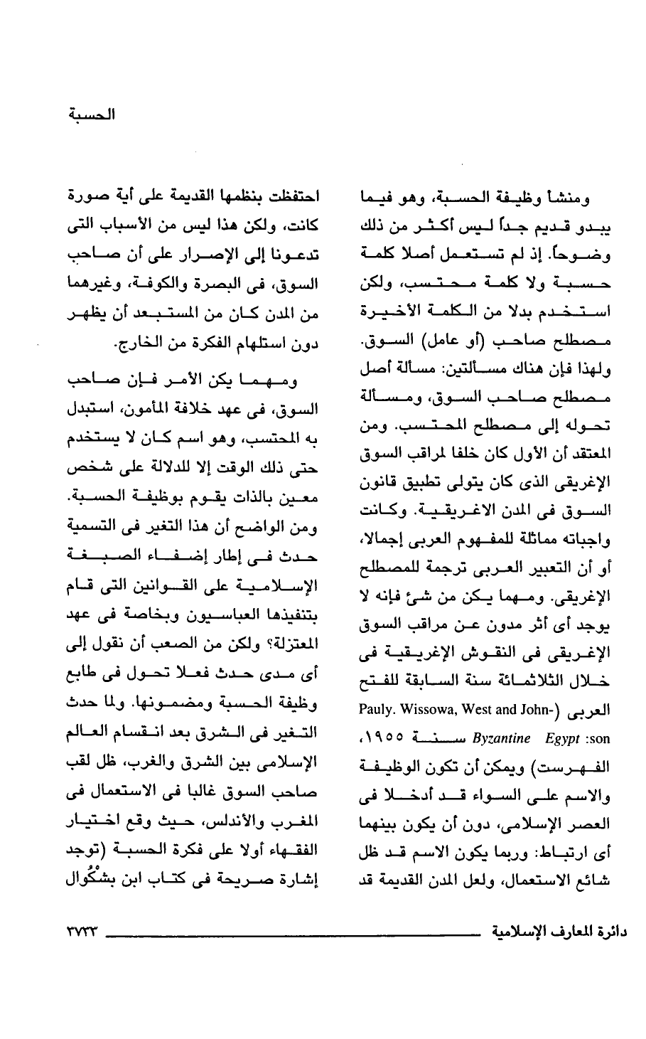 ومنشأ وظيفة الحسبة، وهو فيما يبدو قديم جدًا ليس أكثر من ذلك وضوحًا. إذ لم تستعمل أصلا كلمة حسبة ولا كلمة محتسب، ولكن استخدم بدلا من الكلمة الأخيرة مصطلح صاحب (أو عامل) السوق. ولهذا فإن هناك مسألتين: مسألة أصل مصطلح صاحب السوق، ومسألة تحوله إلى مصطلح المحتسب. ومن المعتقد أن الأول كان خلفا لمراقب السوق الإغريقى الذى كان يتولى تطبيق قانون السوق فى المدن الاغريقية. وكانت واجباته مماثلة للمفهوم العربى إجمالا، أو أن التعبير العربى ترجمة للمصطلح الإغريقى. ومهما يكن من شئ فإنه لا يوجد أى أثر مدون عن مراقب السوق الإغريقى فى النقوش الإغريقية فى خلال الثلاثمائة سنة السابقة للفتح العربى (- Pauly. Wissowa, West and John Byzantine Egypt: son سنة 1955، الفهرست) ويمكن أن تكون الوظيفة والاسم على السواء قد أدخلا فى العصر الإسلامى، دون أن يكون بينهما أى ارتباط: وربما يكون الاسم قد ظل شائع الاستعمال، ولعل المدن القديمة قد احتفظت بنظمها القديمة على أية صورة كانت، ولكن هذا ليس من الأسباب التى تدعونا إلى الإصرار على أن صاحب السوق، فى البصرة والكوفة، وغيرهما من المدن كان من المستبعد أن يظهر دون استلهام الفكرة من الخارج.