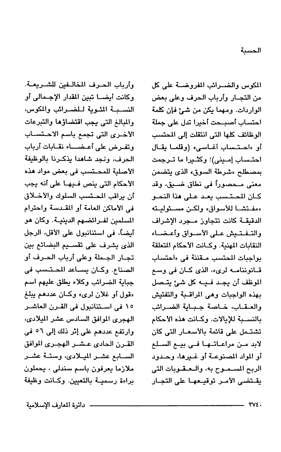 المكوس والضرائب المفروضة على كل من التجار وأرباب الحرف وعلى بعض الواردات. ومهما يكن من شئ فإن كلمة احتساب أصبحت أخيرا تدل على جملة الوظائف كلها التى انتقلت إلى المحتسب أو "احتساب آغاسى" (وقلما يقال احتساب إمينى)؛ وكثيرا ما ترجمت بمصطلح "شرطة السوق" الذى يتضمن معنى محصورًا فى نطاق ضيق، وقد كان المحتسب يعد على هذا النحو "مفتشا للأسواق" ولكن مسئوليته الدقيقة كانت تتجاوز مجرد الإشراف والتفتيش على الأسواق وأعضاء النقابات المهنية. وكانت الأحكام المتعلقة بواجبات المحتسب مقننة فى "احتساب قانوننامه لرى"، الذى كان فى وسع الموظف أن يجد فيه كل شئ يتصل بهذه الواجبات وهى المراقبة والتفتيش والعقاب، خاصة جباية الضرائب بالنسبة للإيالات. وكانت هذه الأحكام تشتمل على قائمة بالأسعار التى كان لا بد من مراعاتها فى بيع السلع أو المواد المصنوعة أو غيرها، وحدود الربح المسموح به، والعقوبات التى يقتضى الأمر توقيعها على التجار وأرباب الحرف المخالفين للشريعة. وكانت أيضا تبين المقدار الإجمالى أو النسبة المئوية للضرائب والمكوس، والمبالغ التى يجب اقتضاؤها والتبرعات الأخرى التى تجمع باسم الاحتساب وتفرض على أعضاء نقابات أرباب الحرف، ونجد شاهدا يذكرنا بالوظيفة الأصلية للمحتسب فى بعض مواد هذه الأحكام التى ينص فيها على أنه يجب أن يراقب المحتسب السلوك والأخلاق فى الأماكن العامة أو المقدسة واحترام المسلمين لفرائضهم الدينية. وكان هو أيضًا، فى استنانبول على الأقل، الرجل الذى يشرف على تقسيم البضائع بين تجار الجملة وعلى أرباب الحرف أو الصناع. وكان يساعد المحتسب فى جباية الضرائب وكلاء يطلق عليهم اسم "قول أوغلان لرى" وكان عددهم يبلغ 15 فى استنانبول فى القرن العاشر الهجرى الموافق السادس عشر الميلادى، وارتفع عددهم على إثر ذلك إلى 56 في القرن الحادى عشر الهجرى الموافق السابع عشر الميلادى، وستة عشر ملازما يعرفون باسم سندلى، يحملون براءة رسمية بالتعيين. وكانت وظيفة