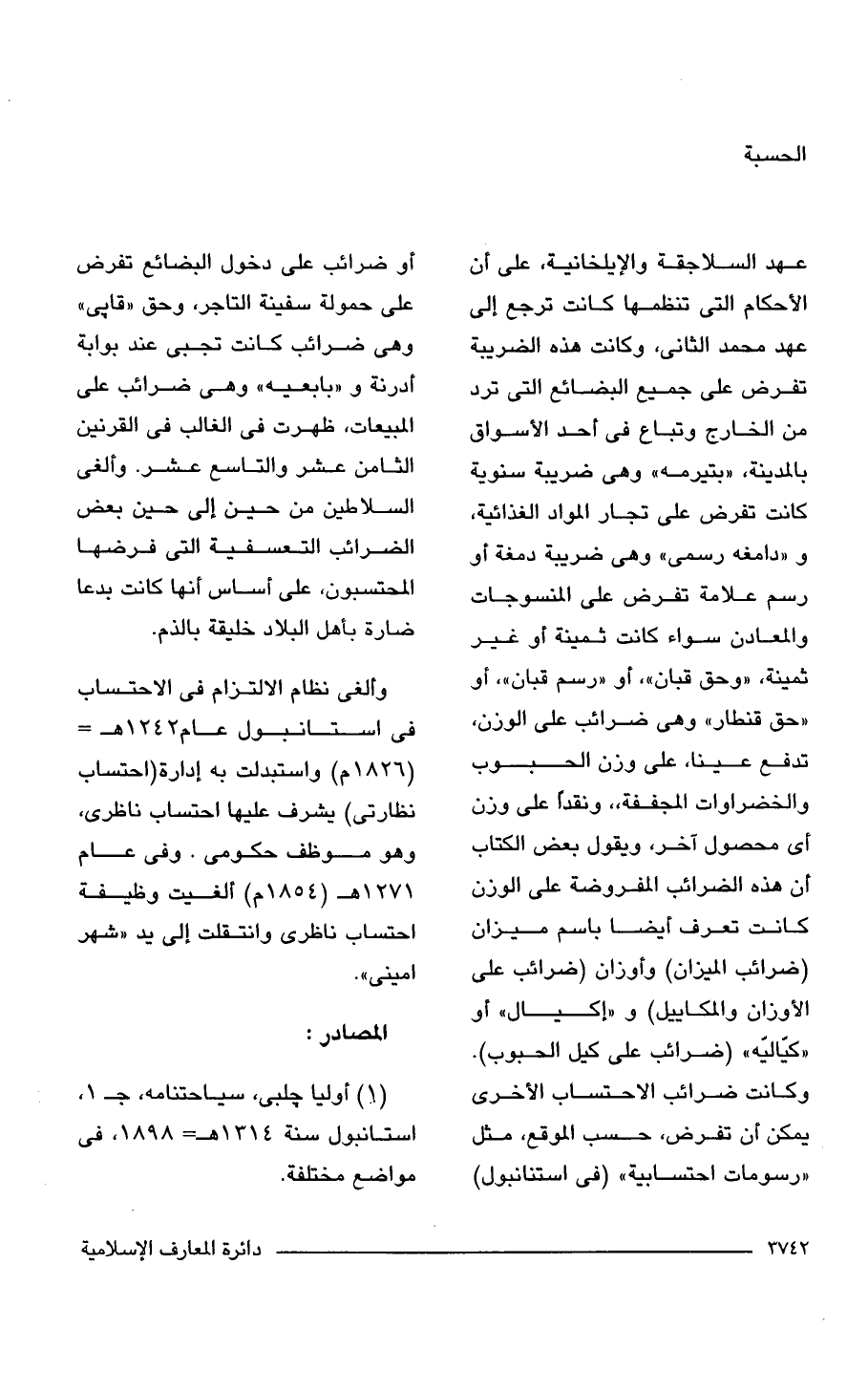 عهد السلاجقة والإيلخانية، على أن الأحكام التى تنظمها كانت ترجع إلى عهد محمد الثانى، وكانت هذه الضريبة تفرض على جميع البضائع التى ترد من الخارج وتباع فى أحد الأسواق بالمدينة، "بتيرمه" وهى ضريبة سنوية كانت تفرض على تجار المواد الغذائية، و"دامغه رسمى" وهى ضريبة دمغة أو رسم علامة تفرض على المنسوجات والمعادن سواء كانت ثمينة أو غير ثمينة، "وحق قبان"، أو "رسم قبان"، أو "حق قنطار" وهى ضرائب على الوزن، تدفع عينا، على وزن الحبوب والخضراوات المجففة، ، ونقدًا على وزن أى محصول آخر، ويقول بعض الكتاب أن هذه الضرائب المفروضة على الوزن كانت تعرف أيضا باسم ميزان (ضرائب الميزان) وأوزان (ضرائب على الأوزان والمكاييل) و"إكيال" أو "كيّاليّه" (ضرائب على كيل الحبوب). وكانت ضرائب الاحتساب الأخرى يمكن أن تفرض، حسب الموقع، مثل "رسومات احتسابية" (فى استنانبول) أو ضرائب على دخول البضائع تفرض على حمولة سفينة التاجر، وحق "قابى" وهى ضرائب كانت تجبى عند بوابة أدرنة و"بابعيه" وهى ضرائب على المبيعات، ظهرت فى الغالب فى القرنين الثامن عشر والتاسع عشر. وألغى السلاطين من حين إلى حين بعض الضرائب التعسفية التى فرضها المحتسبون، على أساس أنها كانت بدعا ضارة بأهل البلاد خليقة بالذم.