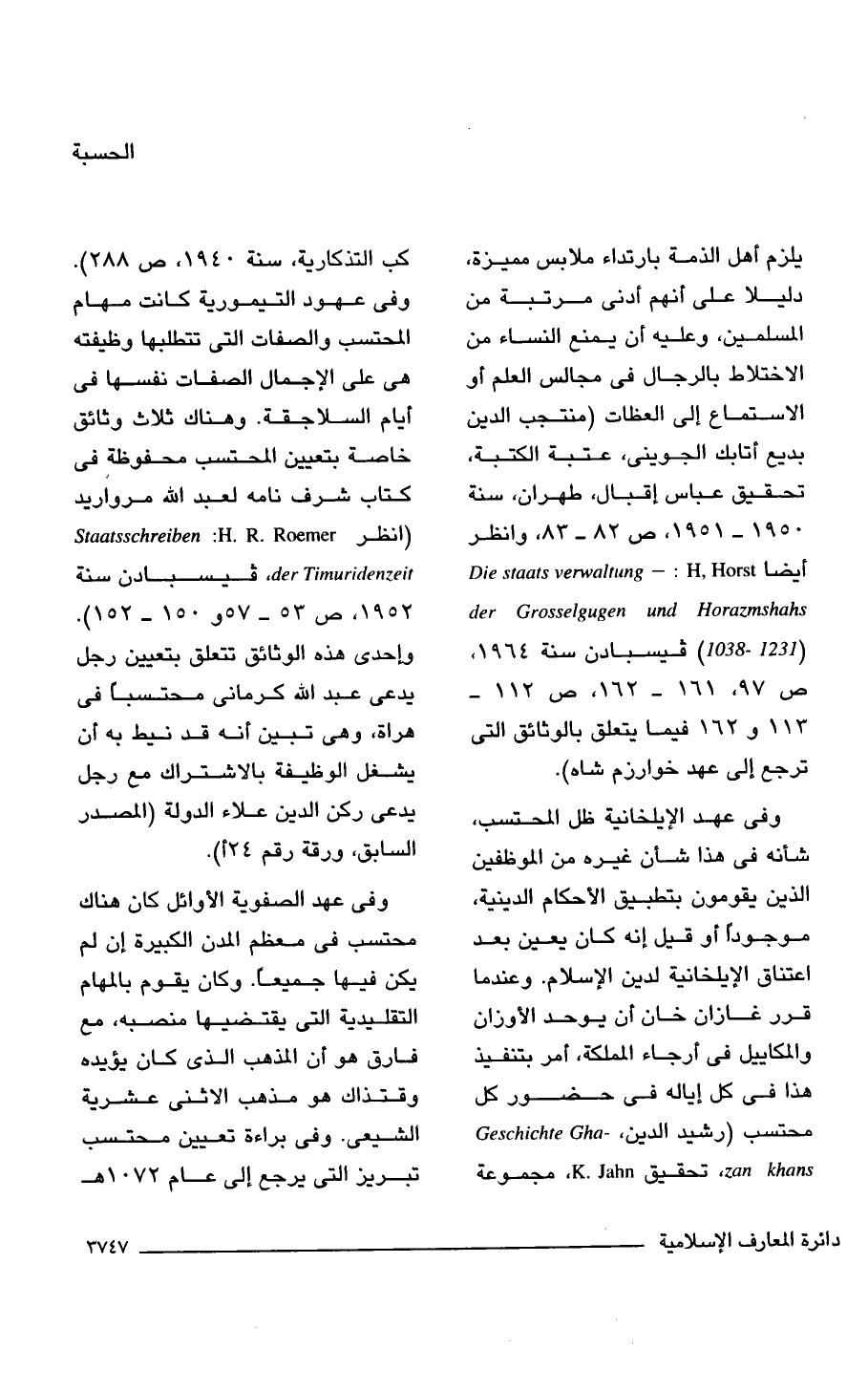 وفى عهد الإيلخانية ظل المحتسب، شأنه فى هذا شأن غيره من الموظفين الذين يقومون بتطبيق الأحكام الدينية، موجودًا أو قيل إنه كان يعين بعد اعتناق الإيلخانية لدين الإسلام. وعندما قرر غازان خان أن يوحد الأوزان والمكاييل فى أرجاء المملكة، أمر بتنفيذ هذا فى كل إياله فى حضور كل محتسب (رشيد الدين، - Geschichte Gha zan khans، تحقيق K.Jahn، مجموعة كب التذكارية، سنة 1940، ص 288). وفى عهود التيمورية كانت مهام المحتسب والصفات التى تتطلبها وظيفته هى على الإجمال الصفات نفسها فى أيام السلاجقة. وهناك ثلاث وثائق خاصة بتعيين المحتسب محفوظة فى كتاب شرف نامه لعبد الله مرواريد (انظر Staatsschreiben: H. R. Roemer der Timuridenzeit, فيسبادن سنة 1952، ص 53 - 57 و 150 - 152). وإحدى هذه الوثائق تتعلق بتعيين رجل يدعى عبد الله كرمانى محتسبًا فى هراة، وهى تبين أنه قد نيط به أن يشغل الوظيفة بالاشتراك مع رجل يدعى ركن الدين علاء الدولة (المصدر السابق، ورقة رقم 24 أ).
