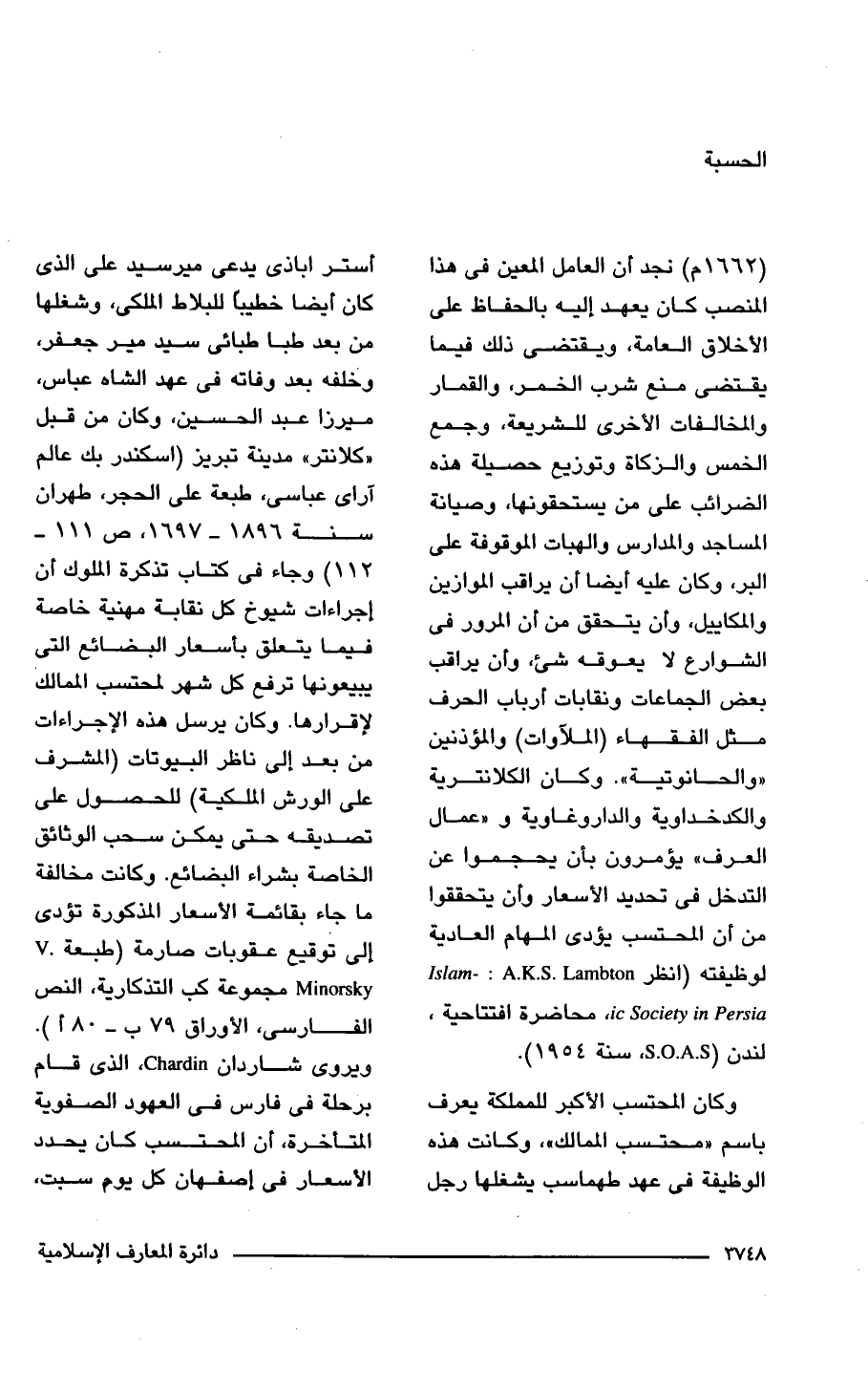 (1662 م) نجد أن العامل المعين فى هذا المنصب كان يعهد إليه بالحفاظ على الأخلاق العامة، ويقتضى ذلك فيما يقتضى منع شرب الخمر، والقمار والمخالفات الأخرى للشريعة، وجمع الخمس والزكاة وتوزيع حصيلة هذه الضرائب على من يستحقونها، وصيانة المساجد والمدارس والهبات الموقوفة على البر، وكان عليه أيضا أن يراقب الموازين والمكاييل، وأن يتحقق من أن المرور فى الشوارع لا يعوقه شئ، وأن يراقب بعض الجماعات ونقابات أرباب الحرف مثل الفقهاء (الملآوات) والمؤذنين "والحانوتية". وكان الكلانترية والكدخداوية والداروغاوية و"عمال العرف" يؤمرون بأن يحجموا عن التدخل فى تحديد الأسعار وأن يتحققوا من أن المحتسب يؤدى المهام العادية لوظيفته (انظر Islam-: A.K.S. Lambton ic Society in Persia، محاضرة افتتاحية، لندن (S.O.A.S، سنة 1954).