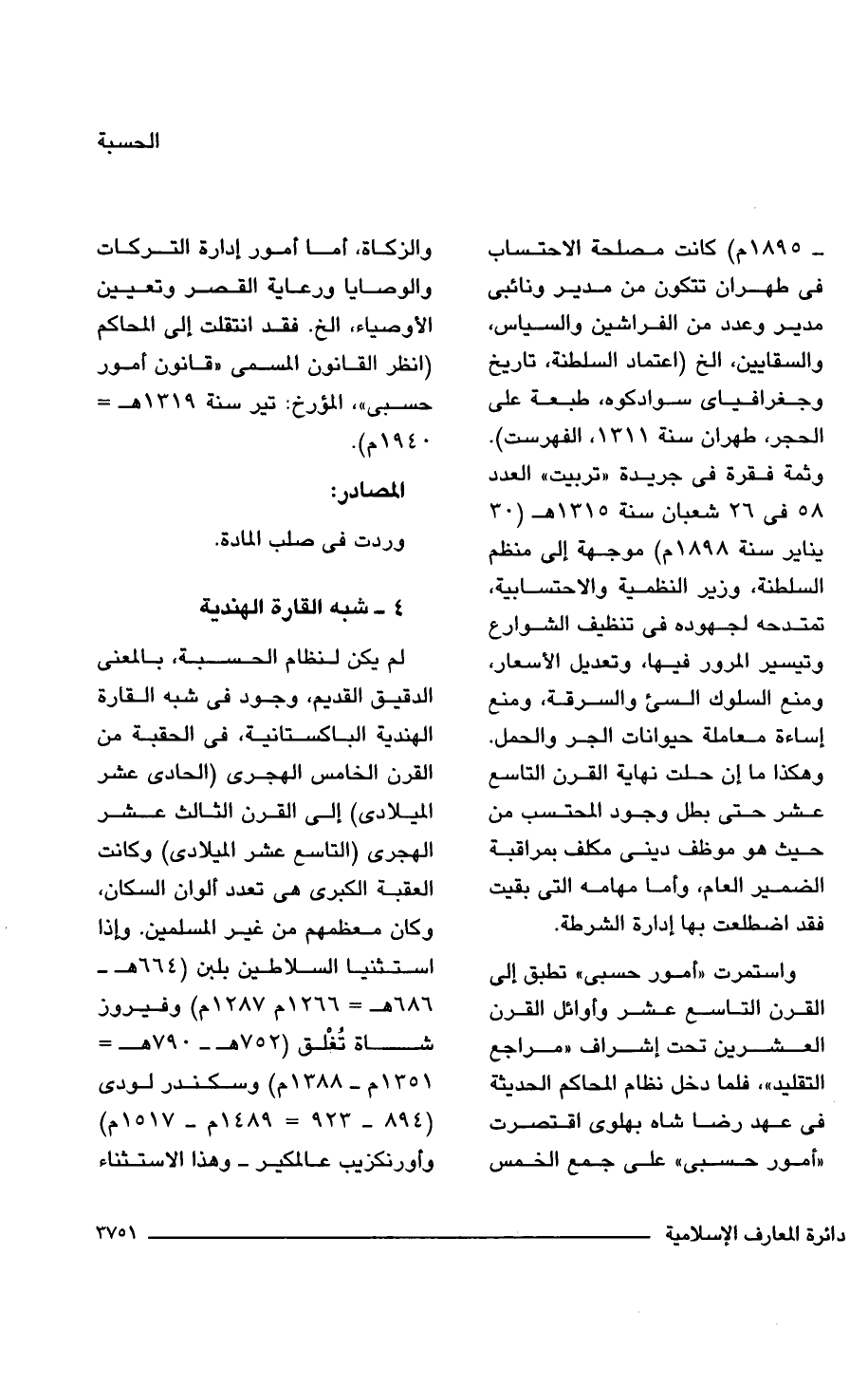 1895 م) كانت مصلحة الاحتساب فى طهران تتكون من مدير ونائبى مدير وعدد من الفراشين والسياس، والسقايين، الخ (اعتماد السلطنة، تاريخ وجغرافياى سوادكوه، طبعة على الحجر، طهران سنة 1311، الفهرست). وثمة فقرة فى جريدة "تربيت" العدد 58 فى 26 شعبان سنة 1315 هـ (30 يناير سنة 1898 م) موجهة إلى منظم السلطنة، وزير النظمية والاحتسابية، تمتدحه لجهوده فى تنظيف الشوارع وتيسير المرور فيها، وتعديل الأسعار، ومنع السلوك السئ والسرقة، ومنع إساءة معاملة حيوانات الجر والحمل. وهكذا ما إن حلت نهاية القرن التاسع عشر حتى بطل وجود المحتسب من حيث هو موظف دينى مكلف بمراقبة الضمير العام، وأما مهامه التى بقيت فقد اضطلعت بها إدارة الشرطة.