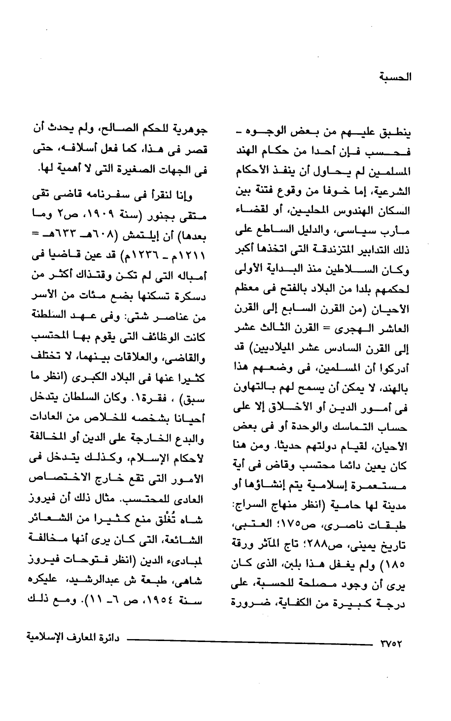 ينطبق عليهم من بعض الوجوه - فحسب فإن أحدا من حكام الهند المسلمين لم يحاول أن ينفذ الأحكام الشرعية، إما خوفا من وقوع فتنة بين السكان الهندوس المحليين، أو لقضاء مأرب سياسى، والدليل الساطع على ذلك التدابير المتزندقة التى اتخذها أكبر وكان السلاطين منذ البداية الأولى لحكمهم بلدا من البلاد بالفتح فى معظم الأحيان (من القرن السابع إلى القرن العاشر الهجرى = القرن الثالث عشر إلى القرن السادس عشر الميلاديين) قد أدركوا أن المسلمين، فى وضعهم هذا بالهند، لا يمكن أن يسمح لهم بالتهاون فى أمور الدين أو الأخلاق إلا على حساب التماسك والوحدة أو فى بعض الأحيان، لقيام دولتهم حديثا. ومن هنا كان يعين دائما محتسب وقاض فى أية مستعمرة إسلامية يتم إنشاؤها أو مدينة لها حامية (انظر منهاج السراج: طبقات ناصرى، ص 175؛ العتبى، تاريخ يمينى، ص 288؛ تاج المآثر ورقة 185) ولم يغفل هذا بلبن، الذى كان يرى أن وجود مصلحة للحسبة، على درجة كبيرة من الكفاية، ضرورة جوهرية للحكم الصالح، ولم يحدث أن قصر فى هذا، كما فعل أسلافه، حتى فى الجهات الصغيرة التى لا أهمية لها.
