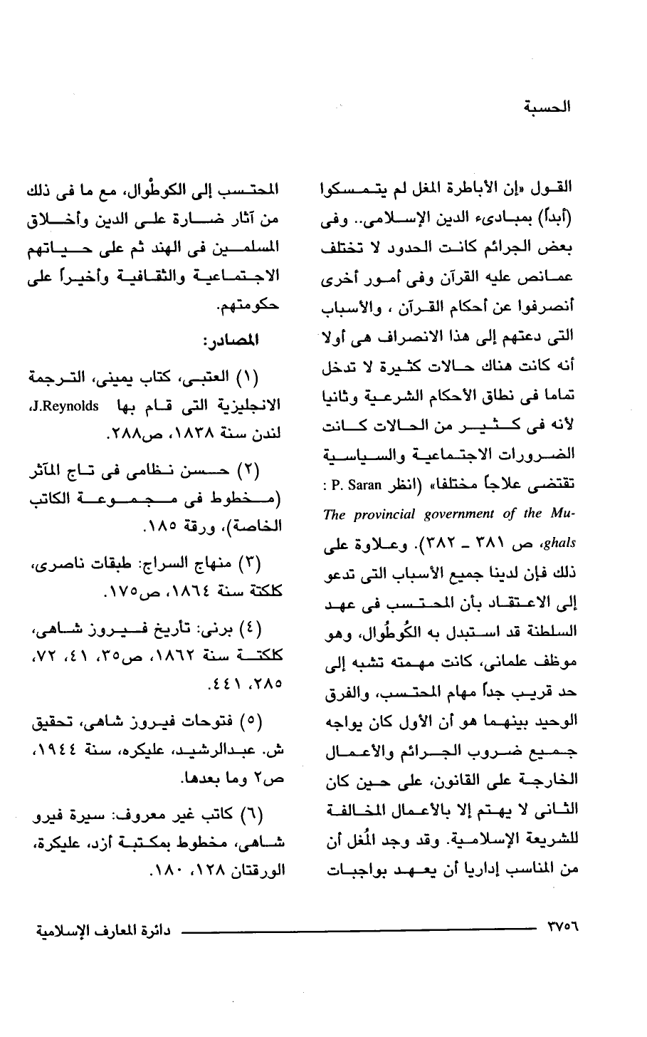 القول "إن الأباطرة المغل لم يتمسكوا (أبدًا) بمبادئ الدين الإسلامى .. وفى بعض الجرائم كانت الحدود لا تختلف عما نص عليه القرآن وفى أمور أخرى أنصرفوا عن أحكام القرآن، والأسباب التى دعتهم إلى هذا الانصراف هى أولا أنه كانت هناك حالات كثيرة لا تدخل تماما فى نطاق الأحكام الشرعية وثانيا لأنه فى كثير من الحالات كانت الضرورات الاجتماعية والسياسية تقتضى علاجًا مختلفًا" (انظر P. Saran: -The provincial government of the Mu ghals، ص 381 - 382). وعلاوة على ذلك فإن لدينا جميع الأسباب التى تدعو إلى الاعتقاد بأن المحتسب فى عهد السلطنة قد استبدل به الكُوطُوال، وهو موظف علمانى، كانت مهمته تشبه إلى حد قريب جدًا مهام المحتسب، والفرق الوحيد بينهما هو أن الأول كان يواجه جميع ضروب الجرائم والأعمال الخارجة على القانون، على حين كان الثانى لا يهتم إلا بالأعمال المخالفة للشريعة الإسلامية. وقد وجد المُغل أن من المناسب إداريا أن يعهد بواجبات المحتسب إلى الكوطْوال، مع ما فى ذلك من آثار ضارة على الدين وأخلاق المسلمين فى الهند ثم على حياتهم الاجتماعية والثقافية وأخيرًا على حكومتهم.