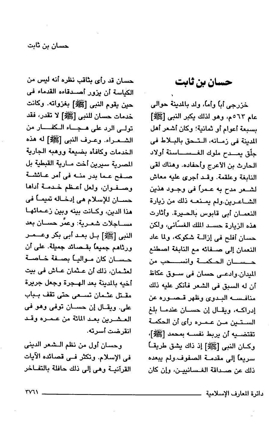 خزرجى أبًا وأمًا، ولد بالمدينة حوالى عام 563 م، وهو لذلك يكبر النبى [- صلى الله عليه وسلم -] بسبعة أعوام أو ثمانية؛ وكان أشعر أهل المدينة فى زمانه، التحق بالبلاط فى جلّق يمدح ملوك الغساسنة أولاد الحارث بن الأعرج وأحفاده. وهناك لقى النابغة وعلقمة. وقد أجرى عليه معاش لشعر مدح به عمرًا فى وجود هذين الشاعرين. ولم يمنعه ذلك من زيارة النعمان أبى قابوس بالحيرة. وأثارت هذه الزيارة حسد الملك الغسّانى، ولكن حسان أفلح فى إزالة شكوكه، ولما عاد النعمان إلى صفائه مع النابغة اصطنع حسان الحكمة وانسحب من الميدان. وادعى حسان فى سوق عكاظ أن له السبق فى الشعر فأنكر عليه ذلك منافسه البدوى وظهر قصوره عن إدراكه، ويقال إن حسان عندما بلغ الستين من عمره رأى أن الحكمة تقتضيه أن يربط نفسه بمحمد [- صلى الله عليه وسلم -]، وكان النبى [- صلى الله عليه وسلم -] إذ ذاك يشق طريقًا سريعًا إلى مقدمة الصفوف. ولم يبعده ذلك عن صداقة الغسانيين، وإن كان حسان قد رأى بثاقب نظره أنه ليس من الكياسة أن يزور أصدقاءه القدماء فى حين يقوم النبى [- صلى الله عليه وسلم -] بغزواته. وكانت خدمات حسان للنبى [- صلى الله عليه وسلم -] لا تقدر، فقد تولى الرد على هجاء الكفار من الشعراء. وعرف النبى [- صلى الله عليه وسلم -] له هذه الخدمات وكافأه بضيعة ووهبه الجارية المصرية سيرين أخت مارية القبطية بل صفح عما بدر منه فى أمر عائشة وصفوان، ولعل أعظم خدمة أداها حسان للإسلام هى إدخاله تميمًا فى هذا الدين، وكانت بينه وبين زعمائها مساجلات شعرية: وعمَّر حسان بعد النبى [- صلى الله عليه وسلم -] بل بعد أبى بكر وعمر ورثاهم جميعًا بقصائد جميلة. على أن حسان كان مواليًا بصفة خاصة لعثمان، ذلك أن عثمان عاش فى بيت أخيه بالمدينة بعد الهجرة وجعل جريرة مقتل عثمان تسعى حتى تقف بباب على. ويقال إن حسان توفى وهو فى العشرين بعد المائة من عمره وقد انقرضت أسرته.