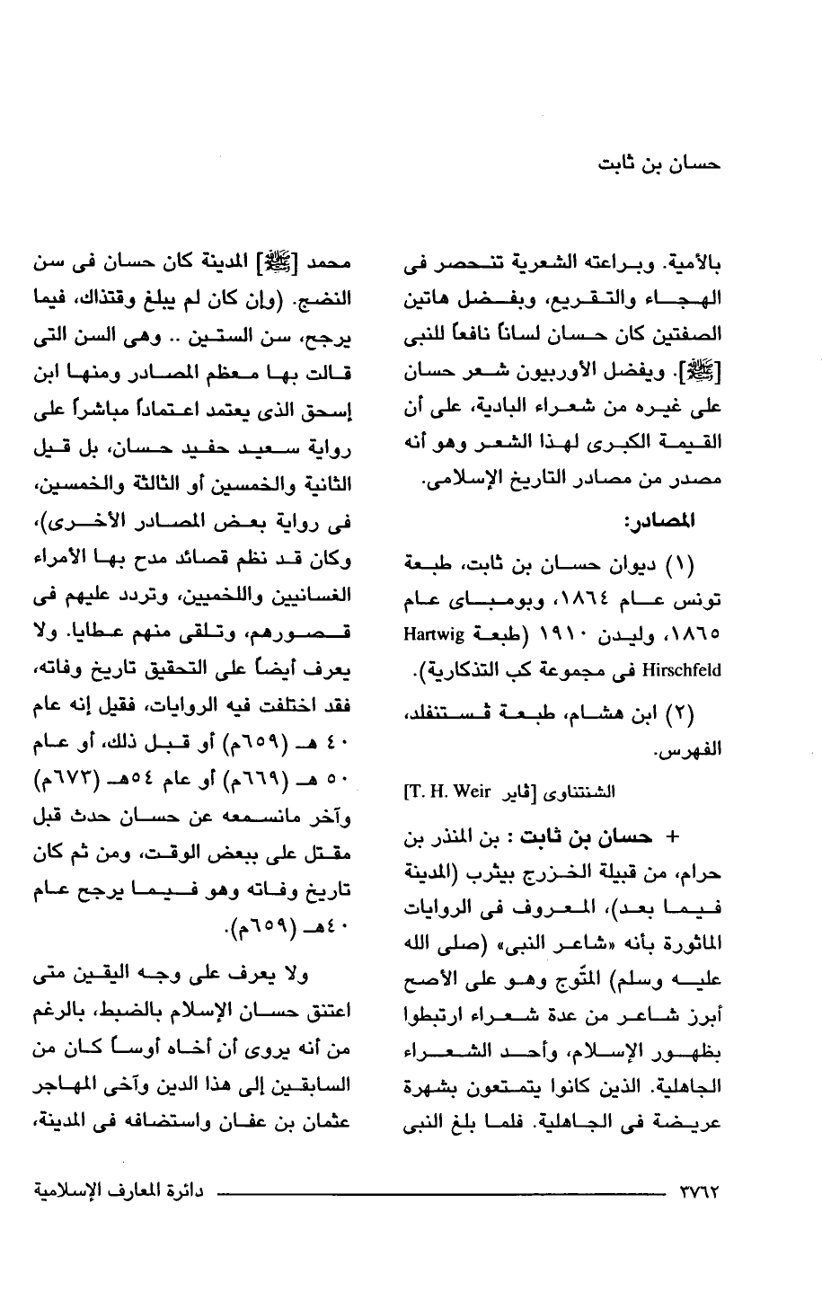 + حسان بن ثابت: بن المنذر بن حرام، من قبيلة الخزرج بيثرب (المدينة فيما بعد)، المعروف فى الروايات المأثورة بأنه "شاعر النبى" (صلى الله عليه وسلم) المتّوج وهو على الأصح أبرز شاعر من عدة شعراء ارتبطوا بظهور الإسلام، وأحد الشعراء الجاهلية. الذين كانوا يتمتعون بشهرة عريضة فى الجاهلية. فلما بلغ النبى محمد [- صلى الله عليه وسلم -] المدينة كان حسان فى سن النضج. (وإن كان لم يبلغ وقتذاك، فيما يرجح، سن الستين .. وهى السن التى قالت بها معظم المصادر ومنها ابن إسحق الذى يعتمد اعتمادًا مباشرًا على رواية سعيد حفيد حسان، بل قيل الثانية والخمسين أو الثالثة والخمسين، فى رواية بعض المصادر الأخرى)، وكان قد نظم قصائد مدح بها الأمراء الغسانيين واللخميين وتردد عليهم فى قصورهم، وتلقى منهم عطايا. ولا يعرف أيضًا على التحقيق تاريخ وفاته، فقد اختلفت فيه الروايات، فقيل إنه عام 40 هـ (659 م) أو قبل ذلك، أو عام 50 هـ (669 م) أو عام 54 هـ (673 م) وآخر ما نسمعه عن حسان حدث قبل مقتل على ببعض الوقت، ومن ثم كان تاريخ وفاته وهو فيما يرجح عام 40 هـ (659 م).