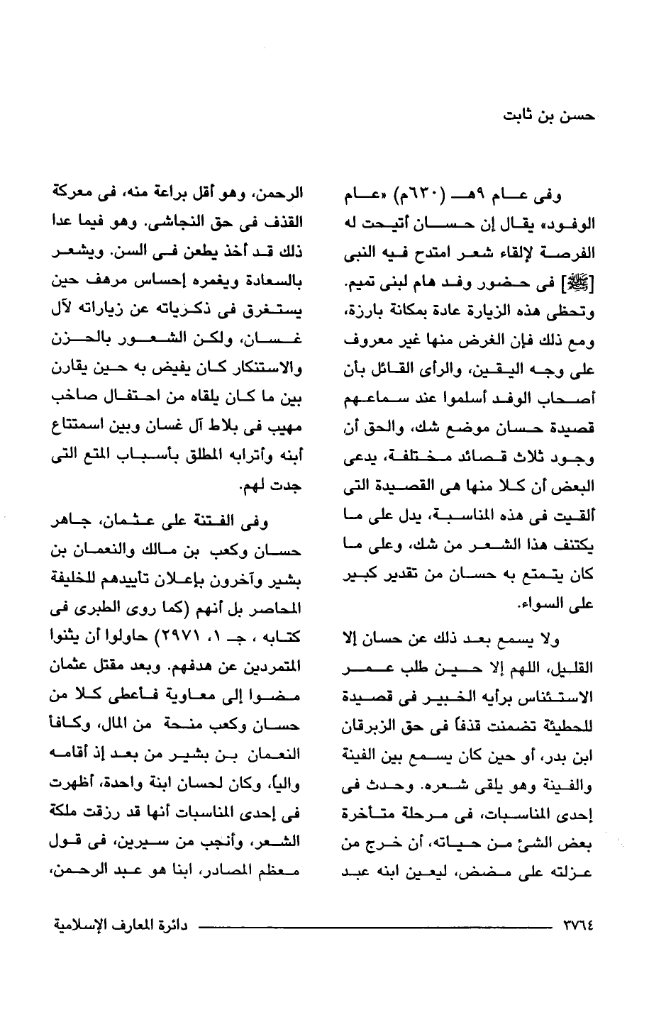 وفى عام 9 هـ (630 م) "عام الوفود" يقال إن حسان أتيحت له الفرصة لإلقاء شعر امتدح فيه النبى [- صلى الله عليه وسلم -] فى حضور وفد هام لبنى تميم. وتحظى هذه الزيارة عادة بمكانة بارزة، ومع ذلك فإن الغرض منها غير معروف على وجه اليقين، والرأى القائل بأن أصحاب الوفد أسلموا عند سماعهم قصيدة حسان موضع شك، والحق أن وجود ثلاث قصائد مختلفة، يدعى البعض أن كلا منها هى القصيدة التى ألقيت فى هذه المناسبة، يدل على ما يكتنف هذا الشعر من شك، وعلى ما كان يتمتع به حسان من تقدير كبير على السواء.